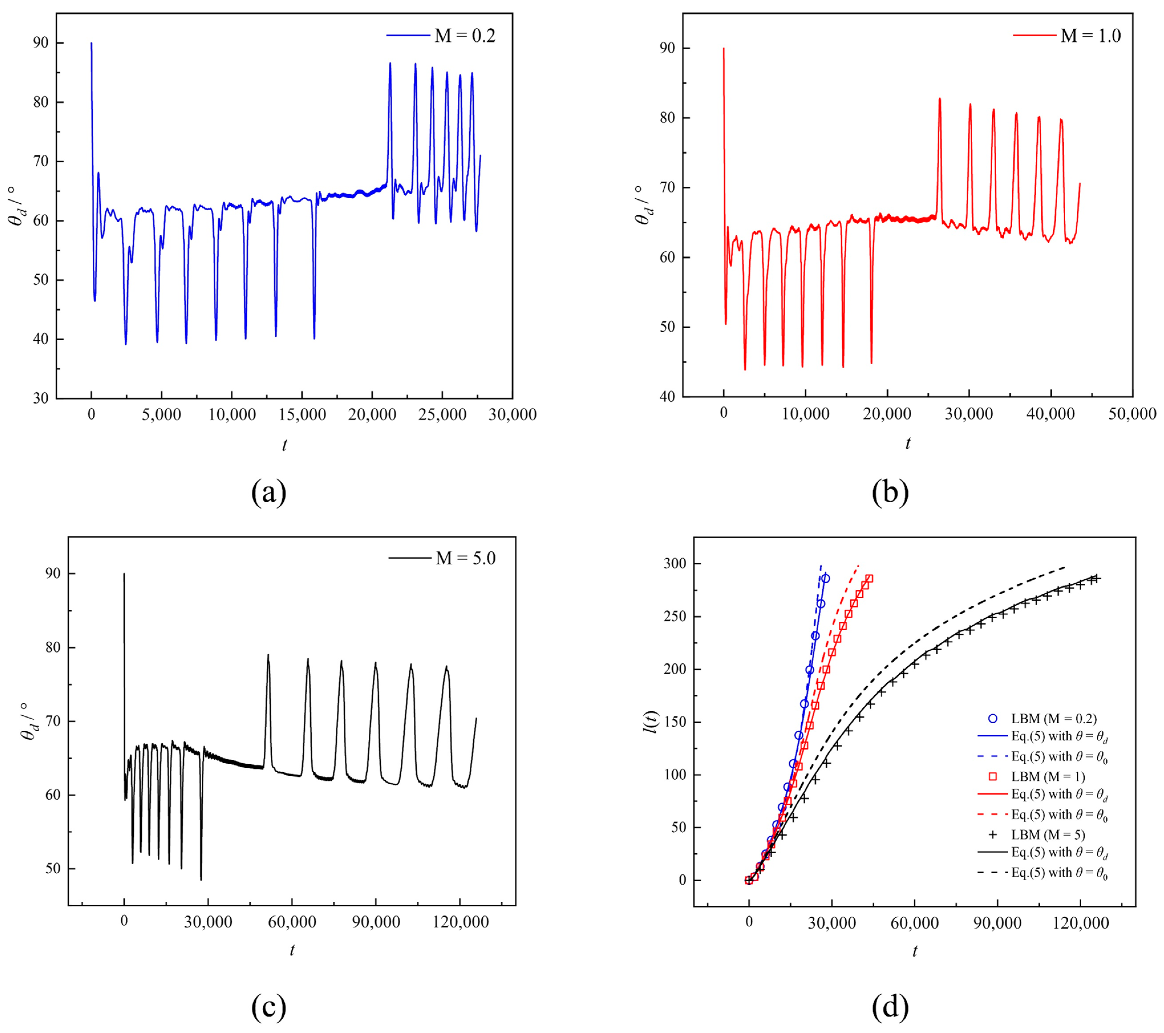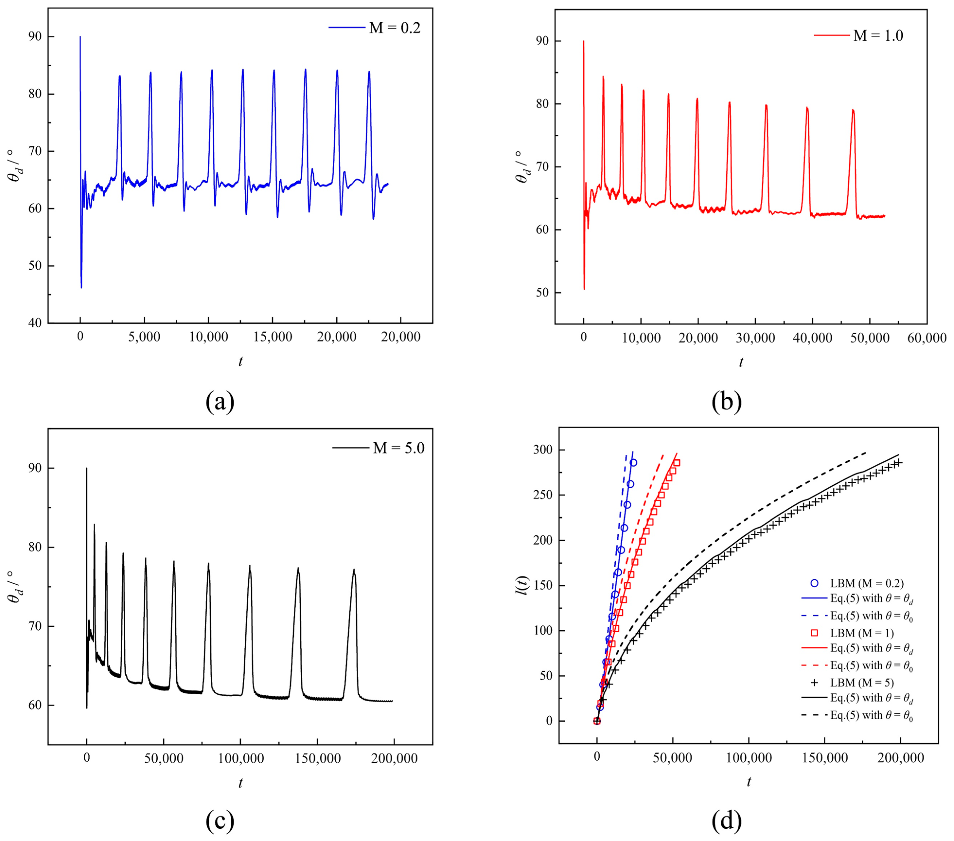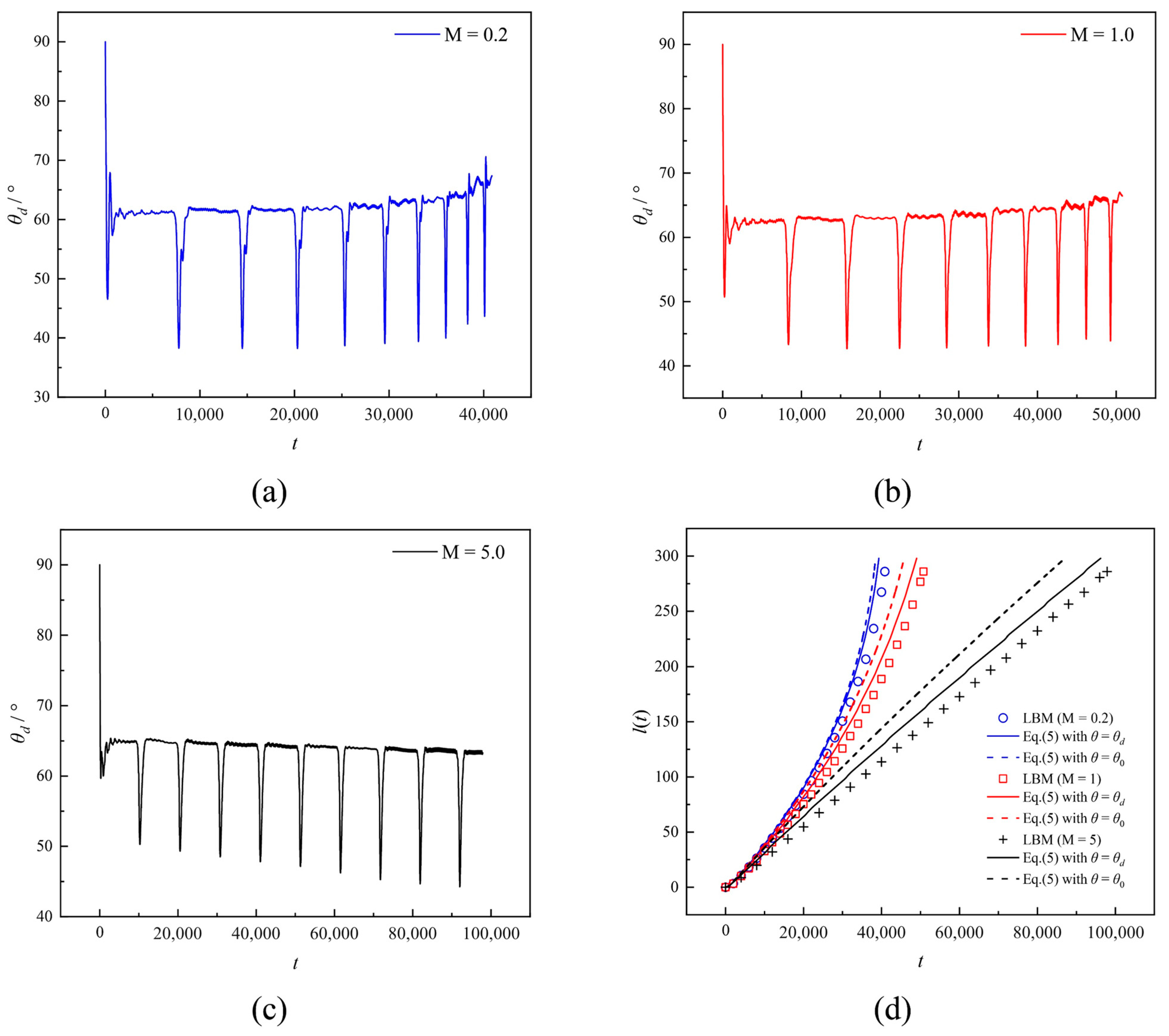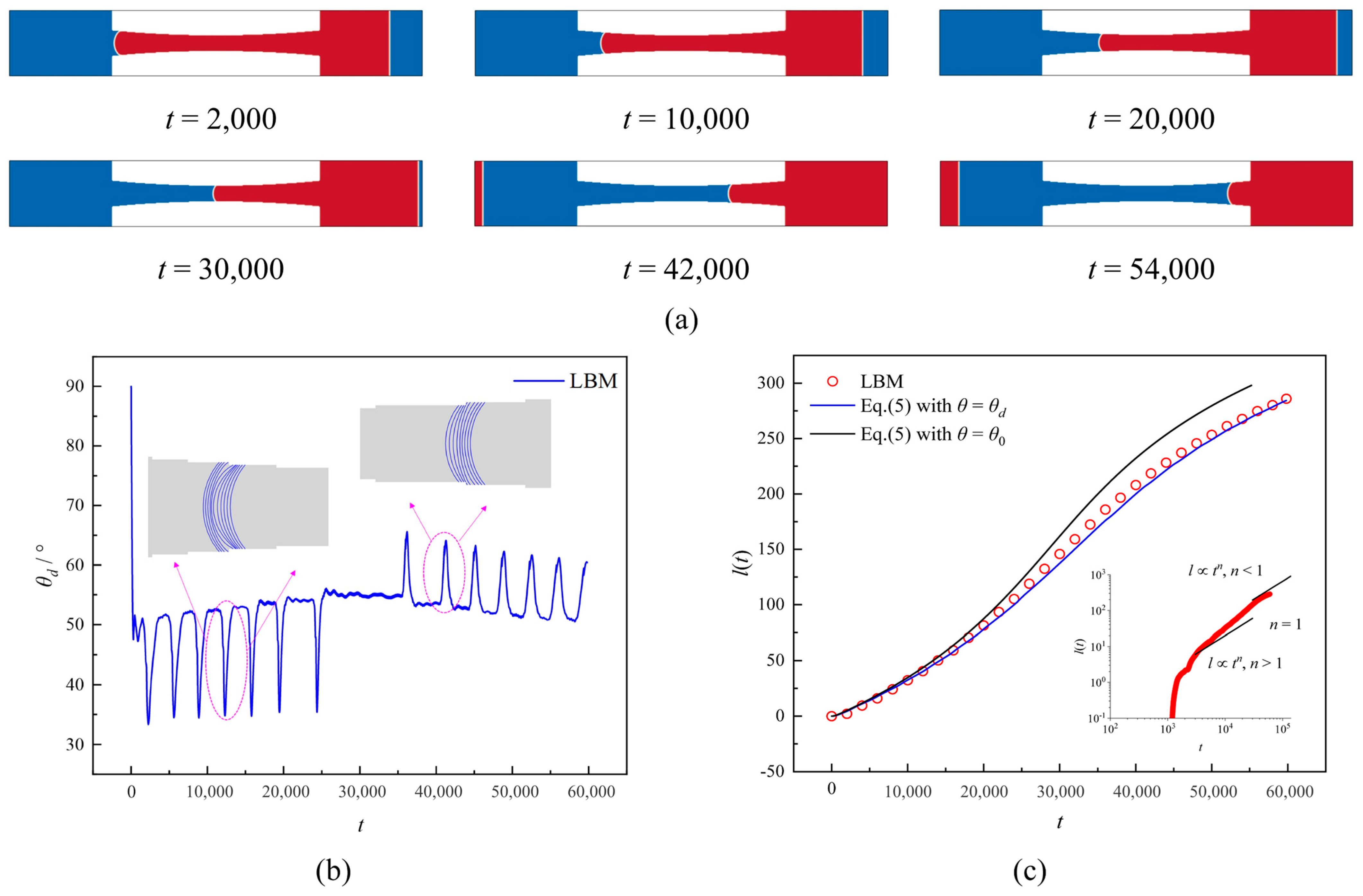 - Wettability exerts a specific influence on the dynamic contact angle (DCA) during imbibition. As wettability increases (indicated by a smaller static contact angle), capillary forces intensify, resulting in faster meniscus movement and an increased disparity between DCA and SCA. Similarly, for the capillary with different wettability, the imbibition length calculated using the LW equation corrected for the DCA almost agrees with LBM.