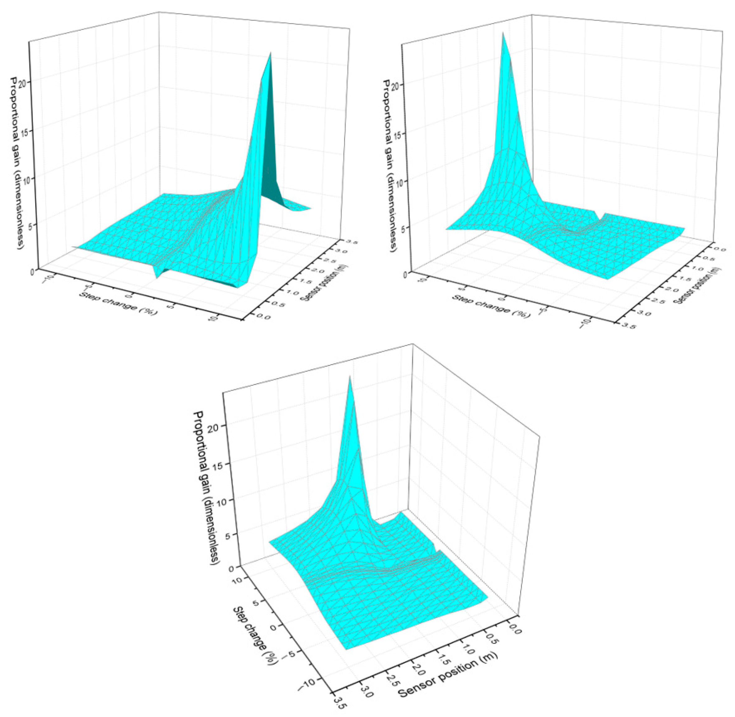 Figure 2. Behavior of proportional gain as the step change and sensor position vary, seen from different perspectives.
