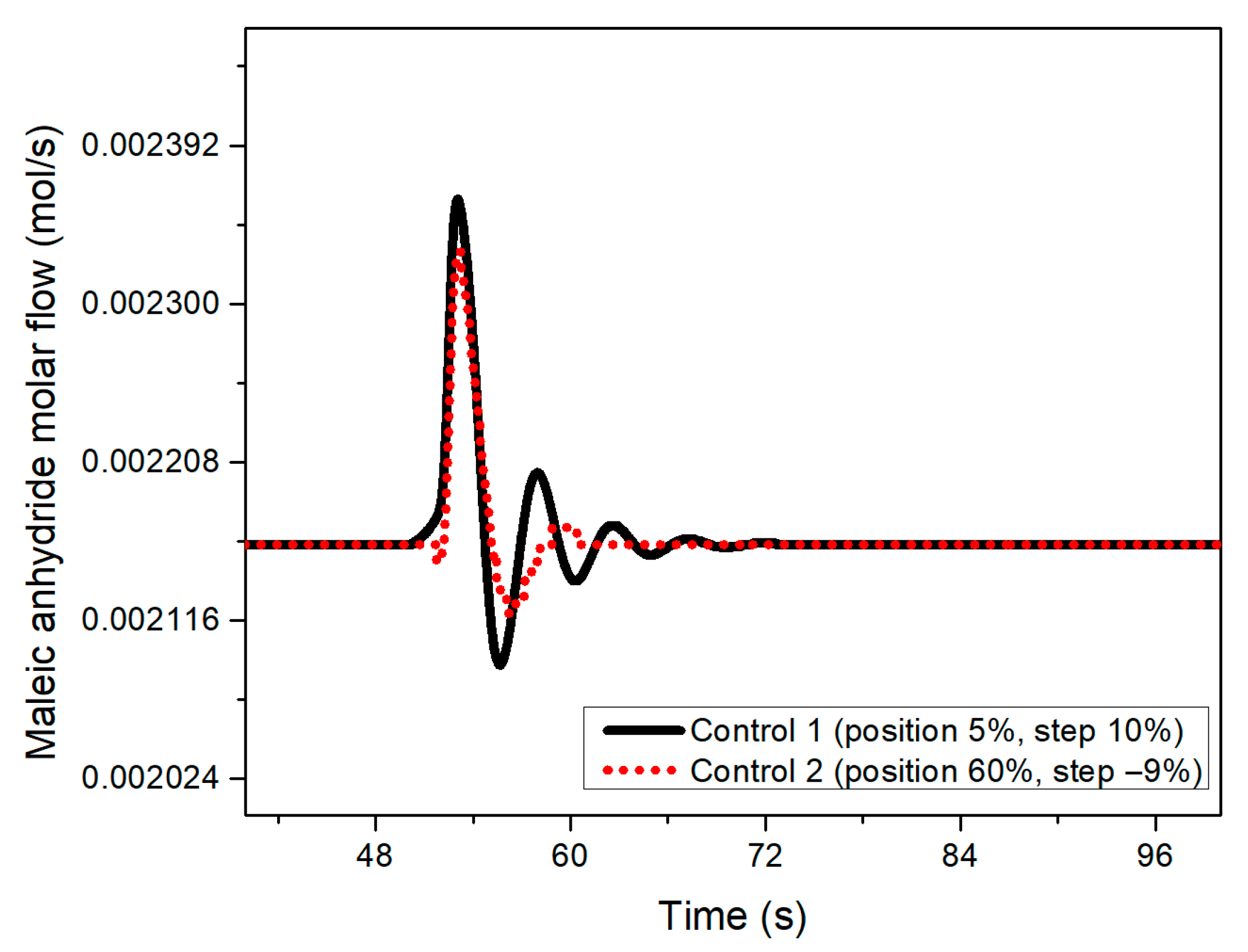 To this end, the values of the response to the step change in the maleic anhydride composition and temperature are taken to calculate the gain (K), dead time (θ), and time constant (τ) parameters and build the approximation to a First-Order Plus Dead Time (FOPDTM) model. The proportional gains and the parameters mentioned above were determined using an empirical tuning procedure guided by the system’s dynamic response. Equation (8) is used for a step change in magnitude ∆m and a FOPDT model [13].