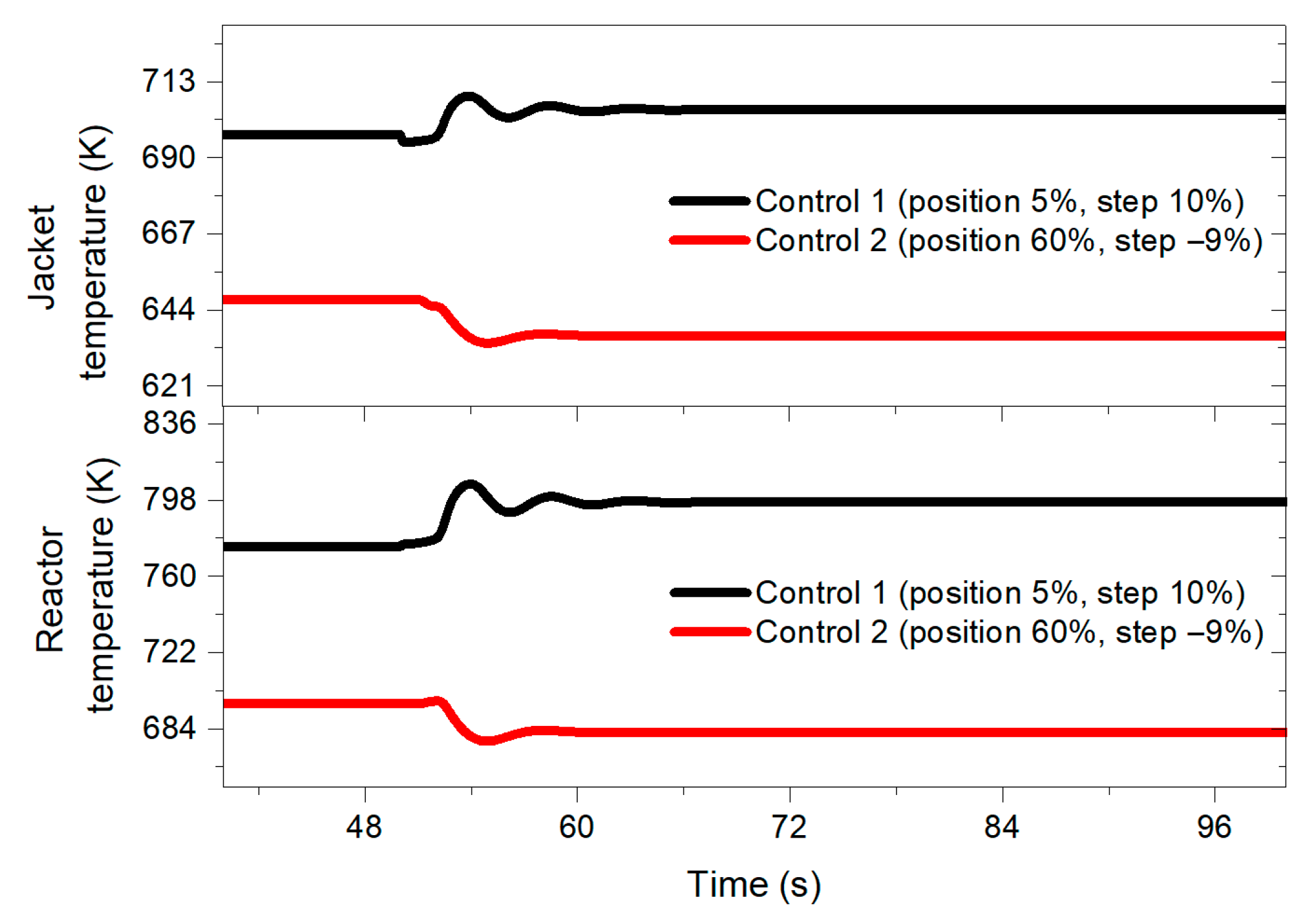 In nonlinear and multi-reaction processes, where the dynamic behavior depends on several concurrent reactions, even small thermal disturbances can alter reaction rates, affect conversion levels, and modify product selectivity, ultimately leading to thermal instabilities or loss of process control. Under these conditions, the cascade control architecture provides a prompt corrective action to energy fluctuations before they propagate and adversely impact the main reaction, thus improving both process stability and operational safety.