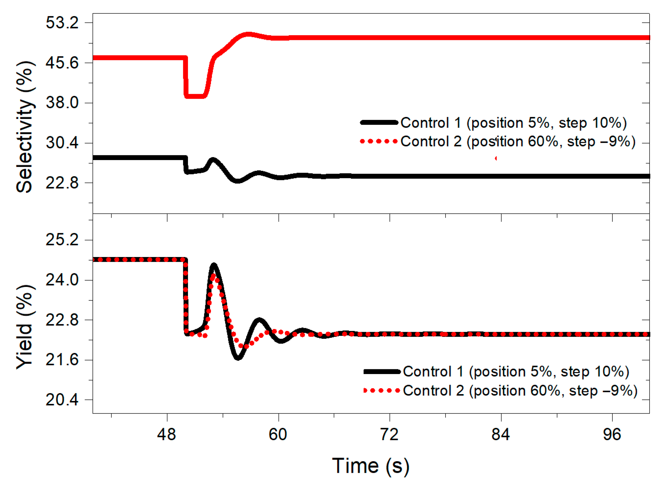 The step sizes were selected following the guidelines of Smith and Corripio (2014) [13], which ensures measurable responses and avoids nonlinear behavior that could distort the system dynamics. Excessively large step sizes can lead the system to unstable or highly nonlinear regions that are demonstrated in the process behavior, warranting that the choice of step size must be consistent with the model that represents the reality of the process, while excessively small steps produce imperceptible variations. Unlike most cascade control studies, which arbitrarily select step sizes to evaluate the response to perturbations, this work seeks to demonstrate that a carefully selected step size, combined with the strategic placement of sensors, can significantly improve the thermal stability and selectivity of the reaction.