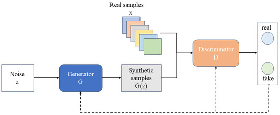 where denotes the real samples x following the data distribution, presents the random noise z following the noise distribution input into the generator, E denotes the expected value with respect to the distribution specified in the subscript, and denotes the generated samples.