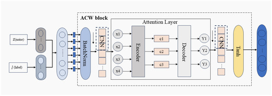 To address the imbalance in one-dimensional fault samples, a generative network is proposed to produce additional fault samples. The overall structure is shown in Figure 3. As illustrated, a random noise z and a class label l are first input into the generator and passed through the attention–convolution–weighting (ACW) module, which mainly consists of one-dimensional convolution and an attention mechanism. Specifically, z and l are concatenated into a long sequence, which is then segmented and normalized using a BatchNorm layer. Local features are extracted through one-dimensional convolution, while global features are captured by the attention mechanism, and the combination of both ultimately produces the generated samples.