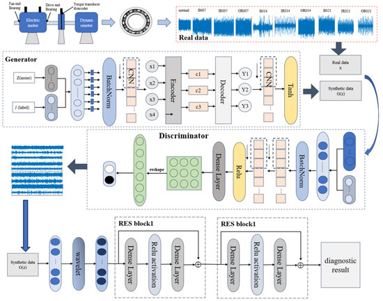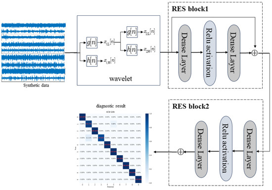 In actual industrial processes, mechanical equipment generally operates under normal conditions, and fault data are often scarce. This scarcity leads to an imbalance in the training dataset and limits the effectiveness of fault diagnosis models. To address this issue, we propose a fault diagnosis learning framework under data imbalance conditions, which integrates the ACW-GAN–based data augmentation approach developed in Section 2 with a wavelet–ResNet classifier. The ACW-GAN enhances the quality and diversity of synthetic samples, thereby expanding the original imbalanced dataset, while wavelet transform and ResNet improve feature extraction and classification performance.