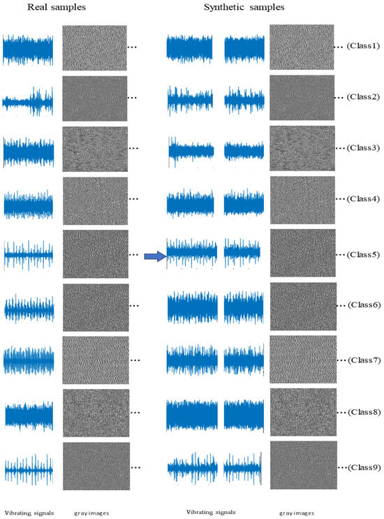 A generative model with good diversity produces signals exhibiting varied waveform patterns, frequencies, and amplitudes, which are clearly distinguishable in the corresponding grayscale images. As shown in Figure 9, the generated fault signals across different categories display distinct image patterns compared with the original samples, demonstrating that the proposed GAN-based method successfully captures category-specific diversity.