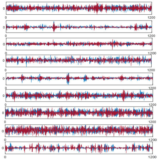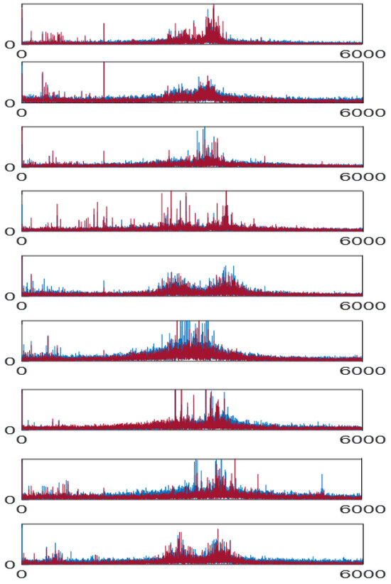 Evaluating the quality of the generated data is essential for assessing its consistency with the original dataset. To this end, signals are examined in both the time and frequency domains to identify potential discrepancies. Nine categories of experimental data were selected, with their time-domain and frequency-domain representations shown in Figure 10 (where the x-axis represents sampling points and the y-axis represents normalized amplitude) and Figure 11 (where, the x-axis is now marked as frequency (Hz), and the y-axis is marked as amplitude), respectively. In these figures, the generated data are plotted in red and the original data in blue.