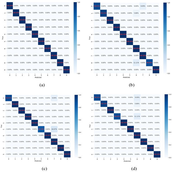 Confusion matrices. (a) ACWGAN; (b) CWGAN; (c) ACGAN; (d) GAN.