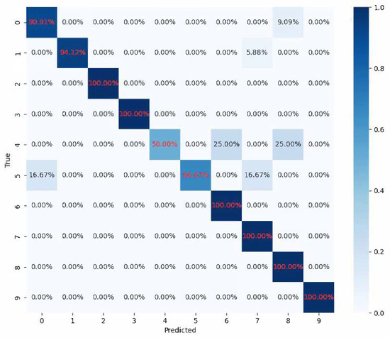 To further demonstrated the proposed fault diagnosis method, a comparative experiment is conducted using traditional CNNs and ResNets for fault diagnosis. Both models were trained with high-quality synthetic samples generated by ACWGAN, and their classification performance was evaluated on the same dataset. The confusion matrix of the CNN-based fault diagnosis results is presented in Figure 13.
