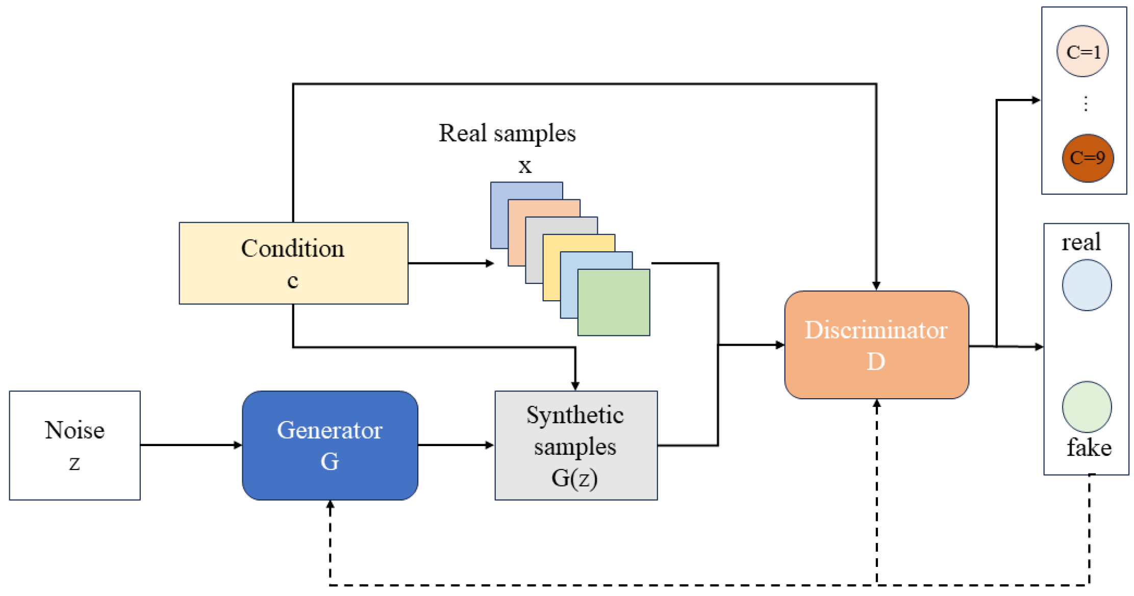 c to produce samples aligned with the specified label, while the discriminator evaluates pairs of samples and conditions together. This additional guidance steers the adversarial learning toward category-consistent outputs. Then, the mathematical form of the CGAN objective function is given below: