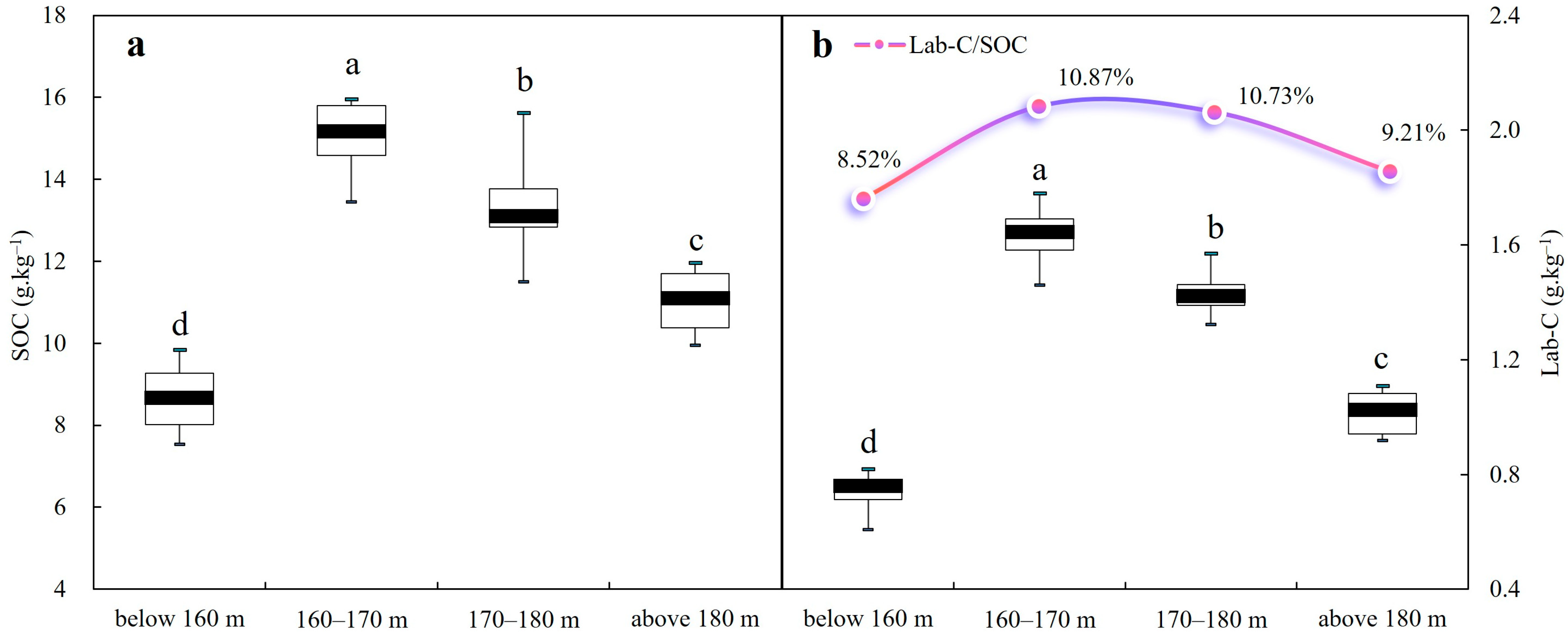 The Lab-C/SOC ratio is commonly used to evaluate the activity and microbial availability of the soil carbon pool. The higher the ratio, the higher the soil carbon pool activity. In this study, the Lab-C/SOC ratio curve (Figure 2b) revealed higher oxidative activity of SOC at 160–180 m, ranging from 10.73% to 10.87%, an increase of 1.52% to 1.66% compared to the control group. The group below 160 m decreased by 0.69% compared to the control group. The variation trend in the distribution proportion of Lab-C across elevation intervals was consistent with that of Lab-C content along the elevation gradient; both showed a unimodal distribution pattern of first increasing and then decreasing, with a peak value observed at an elevation of 160–170 m.
