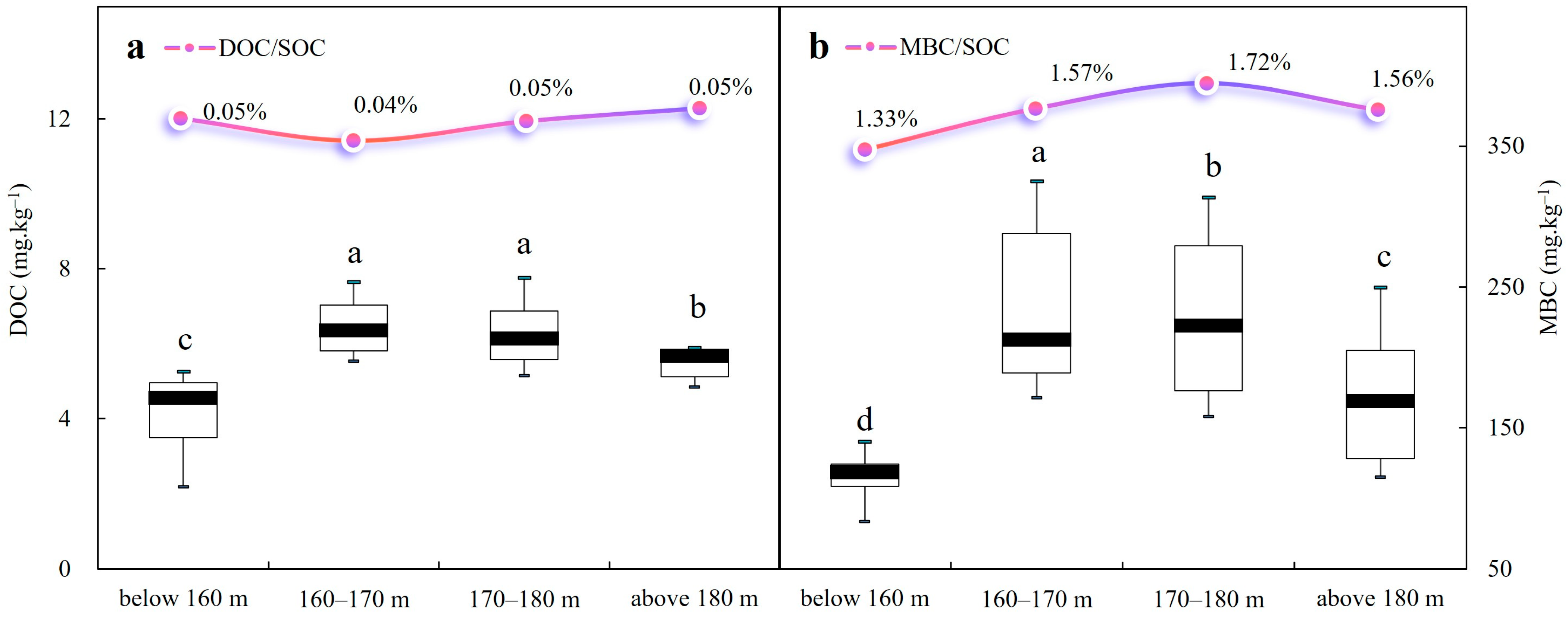 It is generally believed that DOC is composed of carbohydrates, long-chain fatty acid compounds, and proteins that are dissolved in soil water [21]. According to the measurements, the DOC content in the soil at an elevation of 160–170 m was the highest in our study, reaching 6.46 mg/kg. Compared to the control group, the DOC content in the soil at elevations of 160–170 m and 170–180 m increased by 17.8% and 14.5% respectively, with no significant difference. Conversely, samples from below 160 m recorded the lowest DOC content (4.13 mg/kg), which was significantly reduced by 1.36 mg/kg compared to the control group. The overall trend in DOC content across elevations was as follows: 160–170 m > 170–180 m > above 180 m > below 160 m (Figure 3a).
