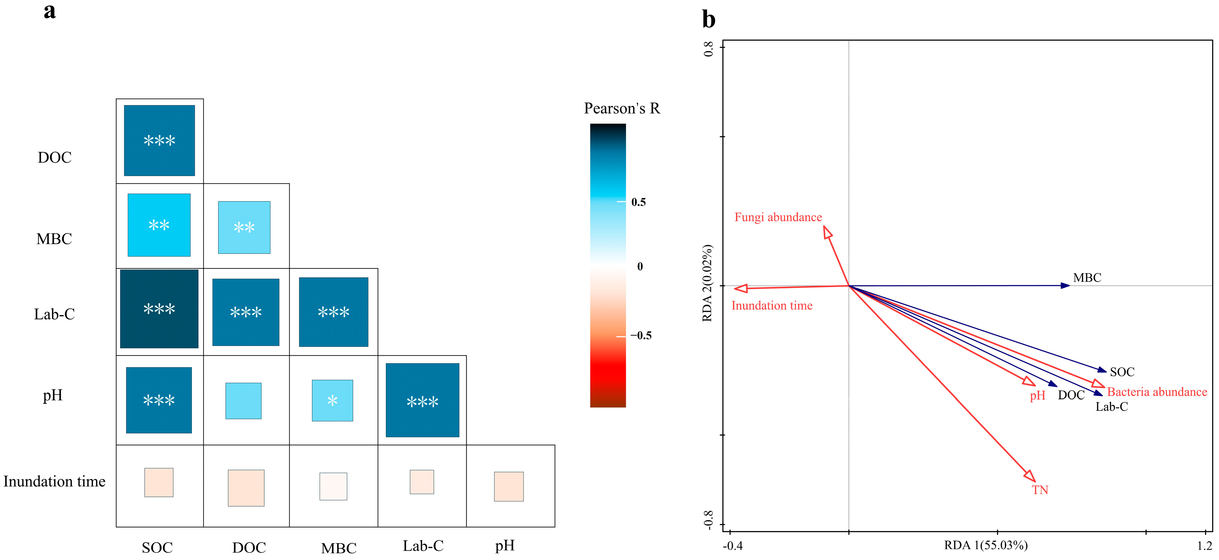 Based on correlation analysis (Figure 4a), fungal abundance showed a significant positive correlation with inundation time (p < 0.001), indicating that fungal abundance increases with prolonged inundation. However, neither variable was significantly correlated with other indicators (p > 0.05). Significant positive correlations were observed among SOC, DOC, MBC, Lab-C, pH, TN, and bacterial abundance (p < 0.05). Notably, Lab-C was identified as the primary factor driving changes in SOC, a finding further supported by stepwise multiple regression analysis.