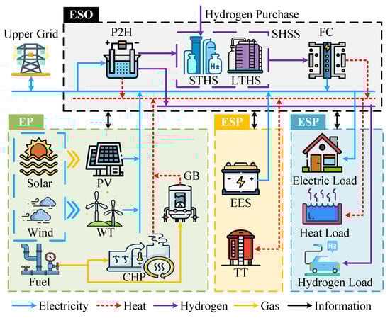 Integrated energy systems (IESs) exploit complementarities among multiple energy carriers to enable cascade utilization and enhance renewable accommodation []. A substantial body of work has examined optimal IES operation. Lisa et al. developed a low-carbon economic operation model that coordinates cogeneration, carbon capture, and power-to-gas (P2G) units []. A multi-time-scale coordinated control strategy for IES with hybrid energy storage was proposed in []. Liu Y. et al. introduced a bidding strategy based on spectral risk measures for IES participation in short-term markets []. Kang L. et al. constructed an IES coupled with an organic Rankine cycle and P2G technology, formulating a multi-objective optimization framework spanning economic, energy, and environmental criteria []. Notably, these studies often treat the energy producer (EP), energy system operator (ESO), load aggregator (LA), and energy storage provider (ESP) as a single centralized decision entity. In practice, these stakeholders belong to different sectors and have access only to local information. Their interactions are therefore strategic, involving distributed decision making and limited information exchange.
