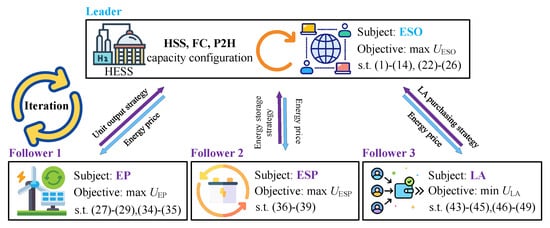 From the above analysis, it can be seen that the EP, ESP, and LA optimize their respective objectives conditional on the internal energy prices announced by the ESO, and their responses in turn shape the ESO’s subsequent pricing and dispatch. As the only network-side agent with system-wide observability, cross-carrier control (P2H, SHSS), and authority to interface with external electricity and hydrogen markets, the ESO determines feasibility via price signals within regulatory bands (Equations (25) and (26)) and system balance constraints (Equations (1)–(14) and (22)–(24)), whereas the EP/ESP are carrier-specific and lack network-level coordination, and the LA has neither pricing nor dispatch authority. This leader–follower interdependence conforms to a dynamic Stackelberg structure; therefore, we formulate a single-leader–multiple-follower Stackelberg game with the ESO as the leader and the EP, ESP, and LA as the followers, consistent with industrial-park governance and established SLMF formulations [,]. The model framework is shown in Figure 3.