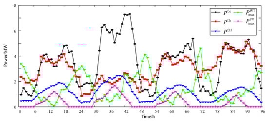 where and are the electric and heat power of EP sold to ESO; ( is the gas cost coefficient of CHP/GB; and , , , and are the operation and maintenance costs for PV, WT, GB, and CHP.