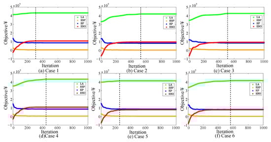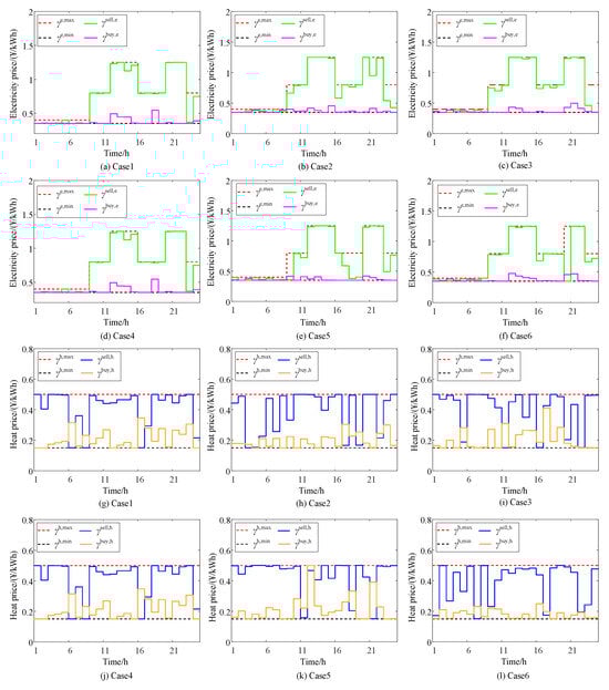The upper and lower limits of the electricity price set by the ESO are consistent with its purchase and sale prices to the distribution network, as shown in Table 1. The upper and lower limits of the heat price are set to CNY 0.5/kWh and CNY 0.15/kWh, respectively []. In the energy plant (EP), six CHP units of 500 kW each and five GB units of 800 kW each are installed. The maximum storage capacity of both the energy storage system (ESS) and the thermal tank (TT) in the energy storage platform (ESP) is 10 MW.