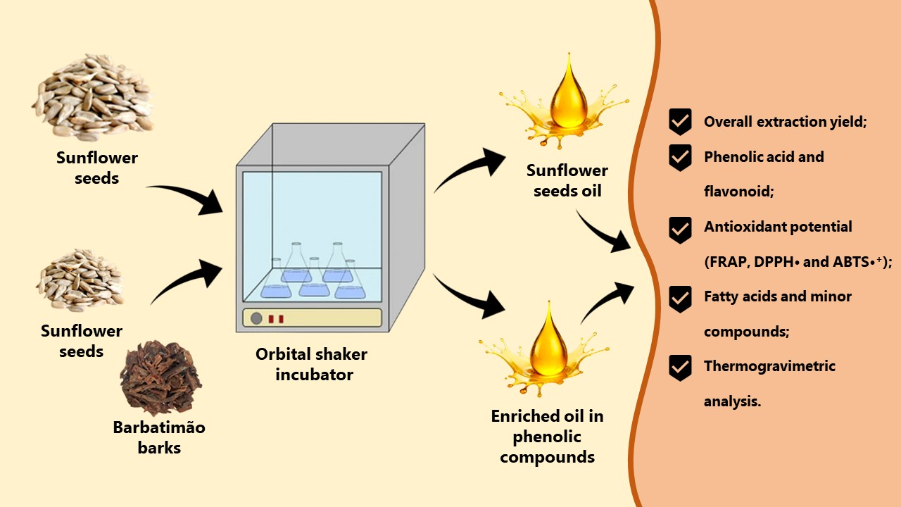 In light of the foregoing, this study aimed to enrich sunflower oil with phenolic compounds from barbatimão bark. Specifically, the objectives were to evaluate the effect of different ratios of sunflower seeds to barbatimão bark, analyze the impact of extraction temperature and time, and characterize the resulting oils.