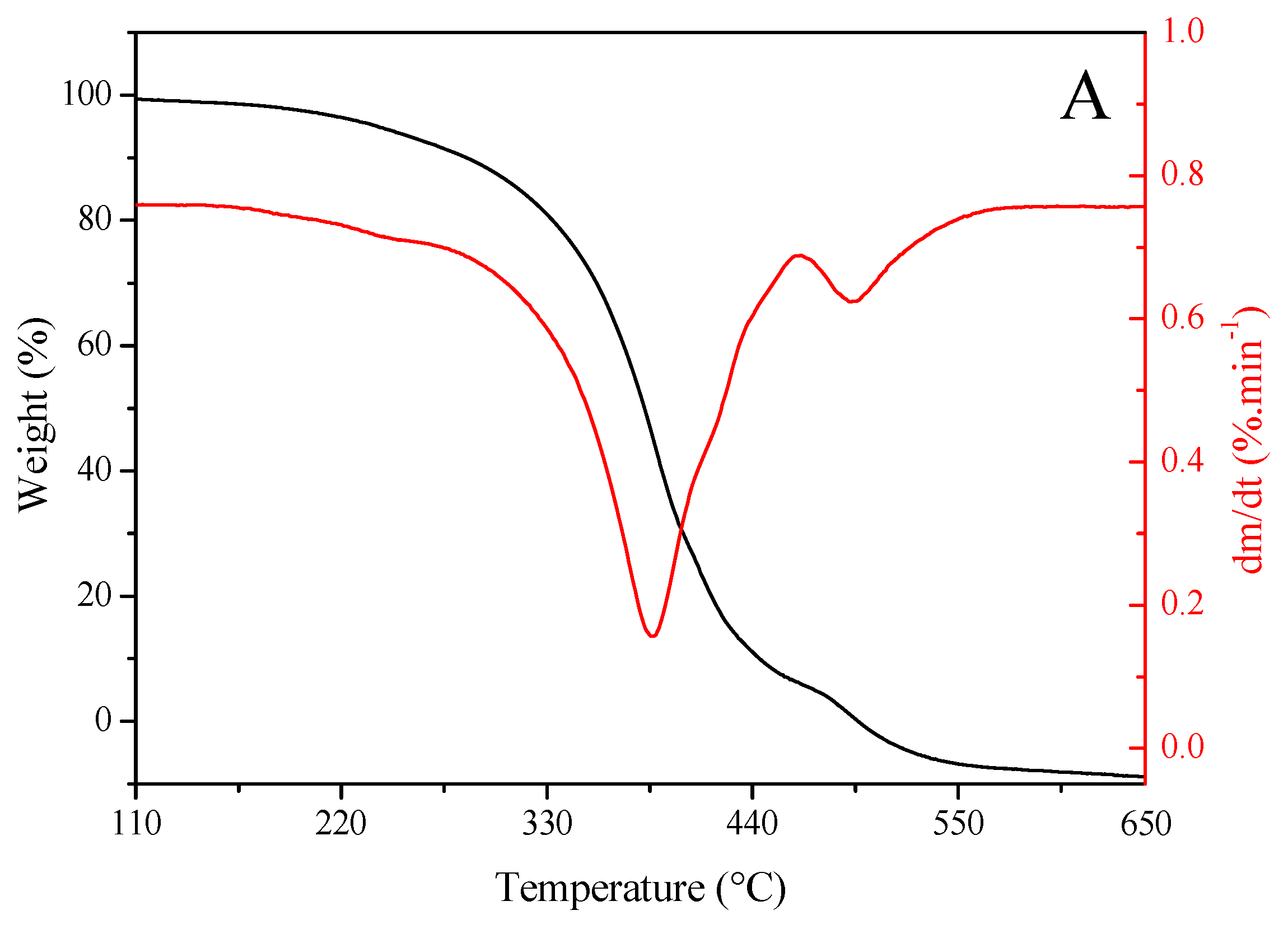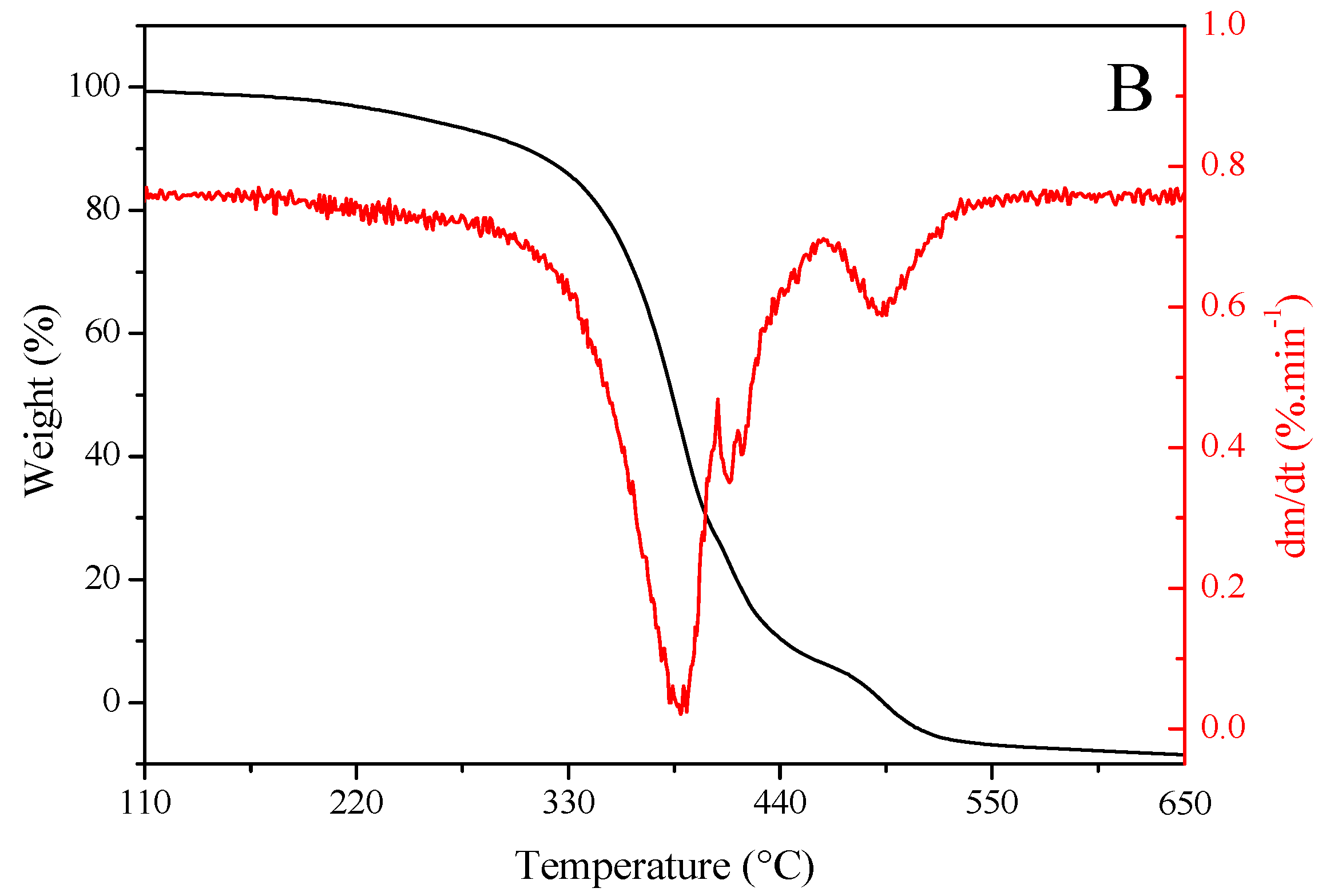 Figure 2. Thermogravimetric (red) and derivative thermogravimetric (black) curves of (A) sunflower seed oil and (B) enriched oil.