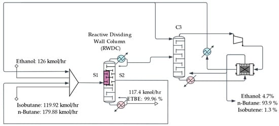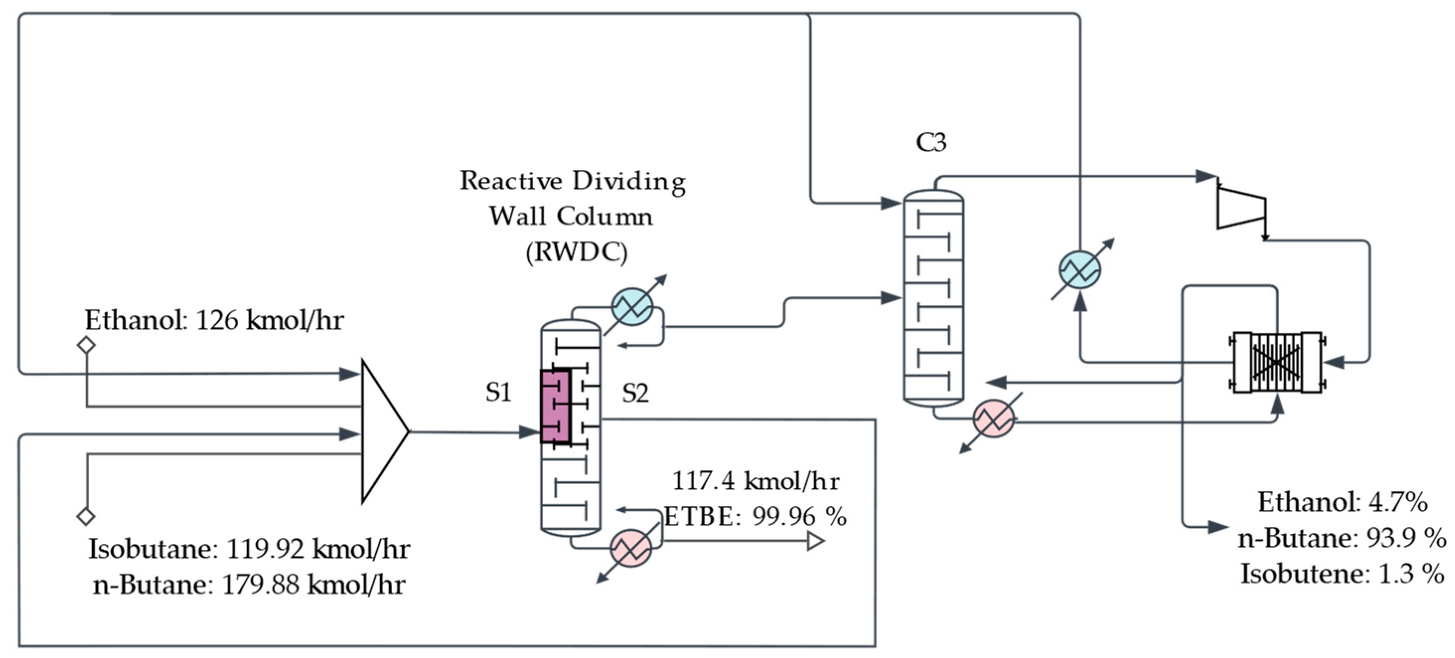 Full intensification of the ETBE process with a reactive dividing wall column (RDWC option).