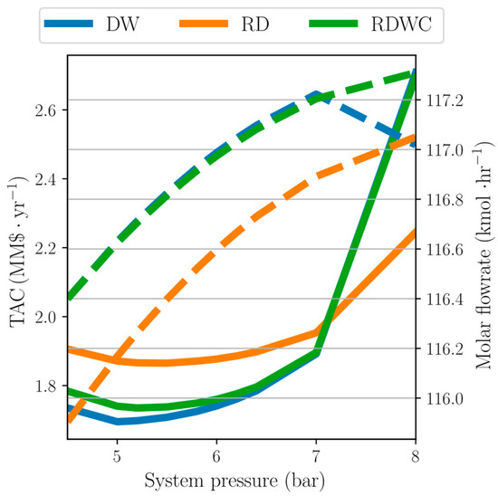 We now examine the effect of optimizing the ETBE flowsheets. As part of the optimization task, the design pressure for each unit is taken as a design variable. To set the bounds for the optimization search, a sensitivity analysis was carried out, and Figure 5 shows the effect of the design pressure on the TAC and ETBE molar flowrate. It can be observed that, for an application within the optimization methodology, proper bounds for the design pressure can be set from 4.5 to 8 bar. Higher operating pressures can significantly increase costs, while operating pressures below 4.5 bar can result in low process efficiencies related to reactant conversions and product quality. The operating conditions of the reactor, separation units, and streams for each flowsheet were then subjected to the optimization procedure.