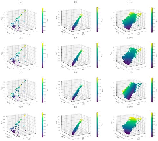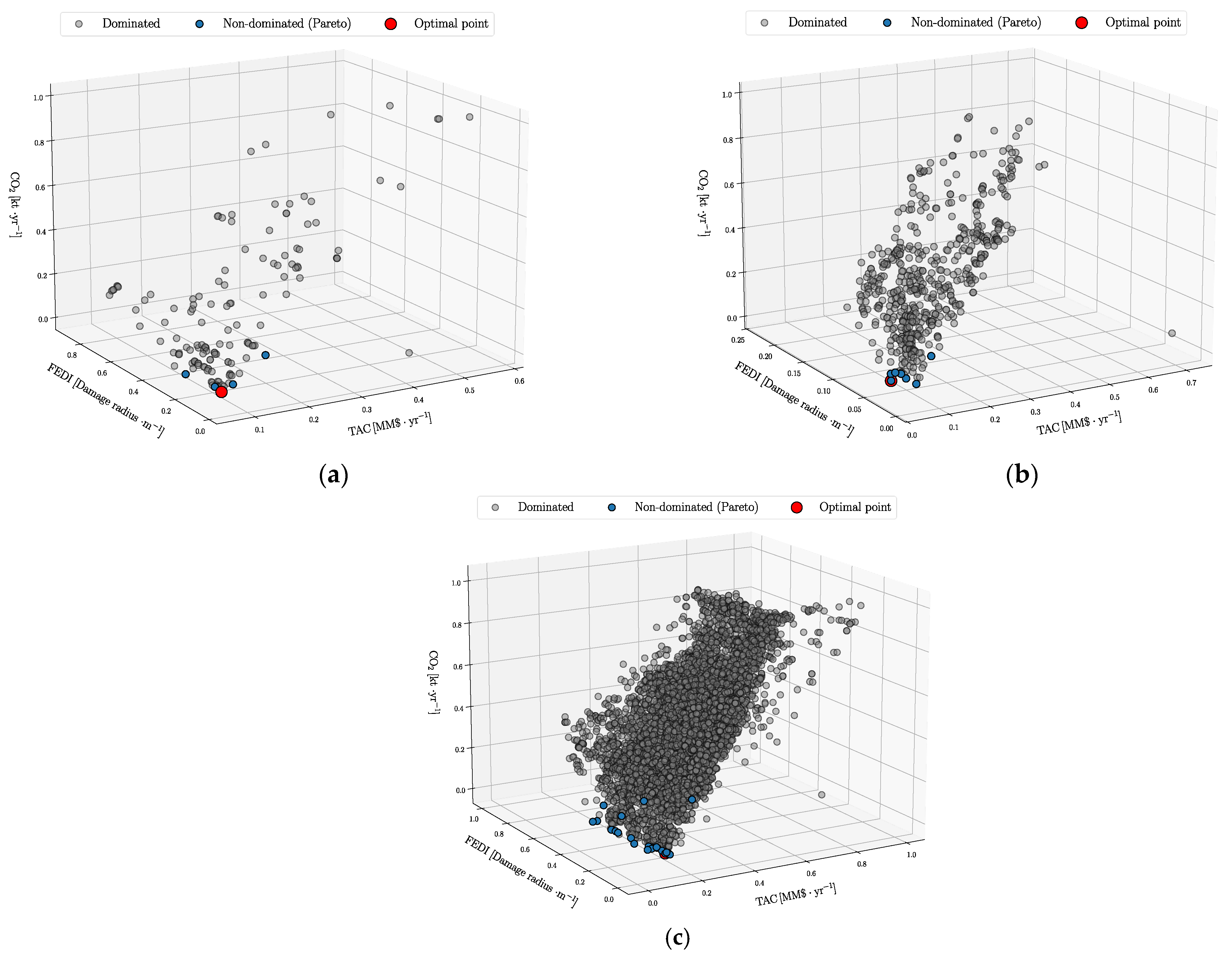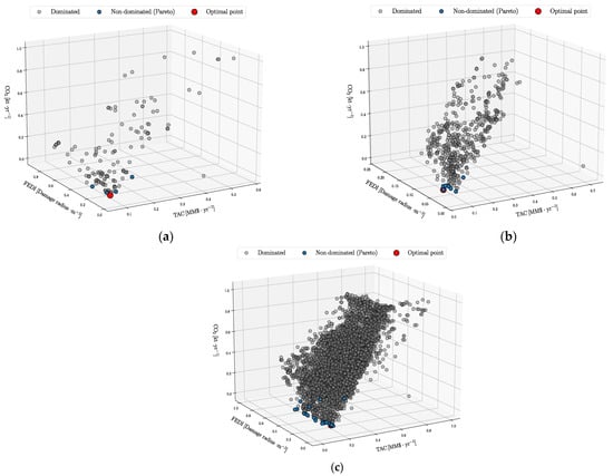 Optimal solutions found for each system: (a) DWC; (b) RD; (c) RDWC. Blue points correspond to non-dominated points, gray dots represent feasible solutions that are dominated, and red points indicate optimal solutions that balance the three objective functions.