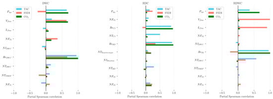 Partial Spearman’s correlation plots between the manipulated variables and the objective functions for each flowsheet.