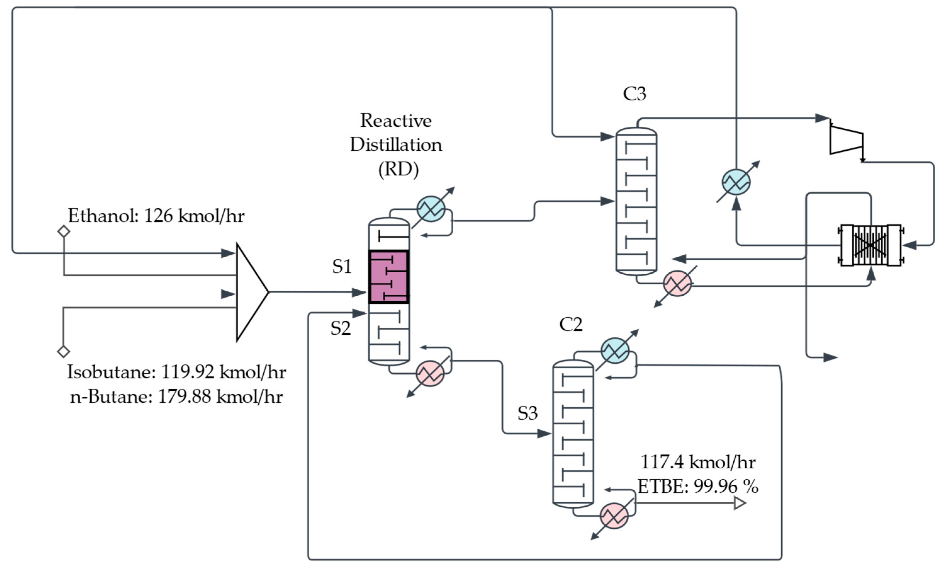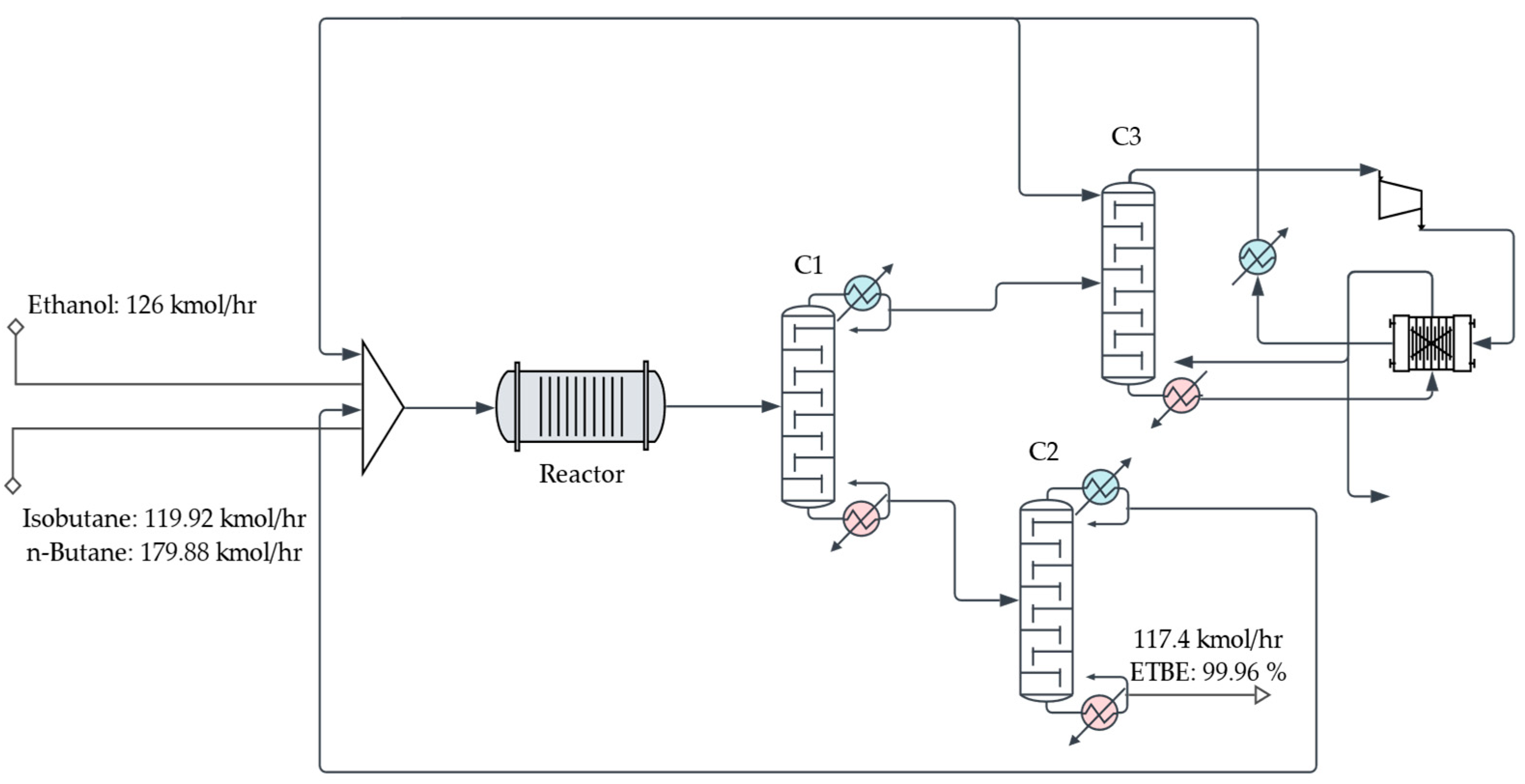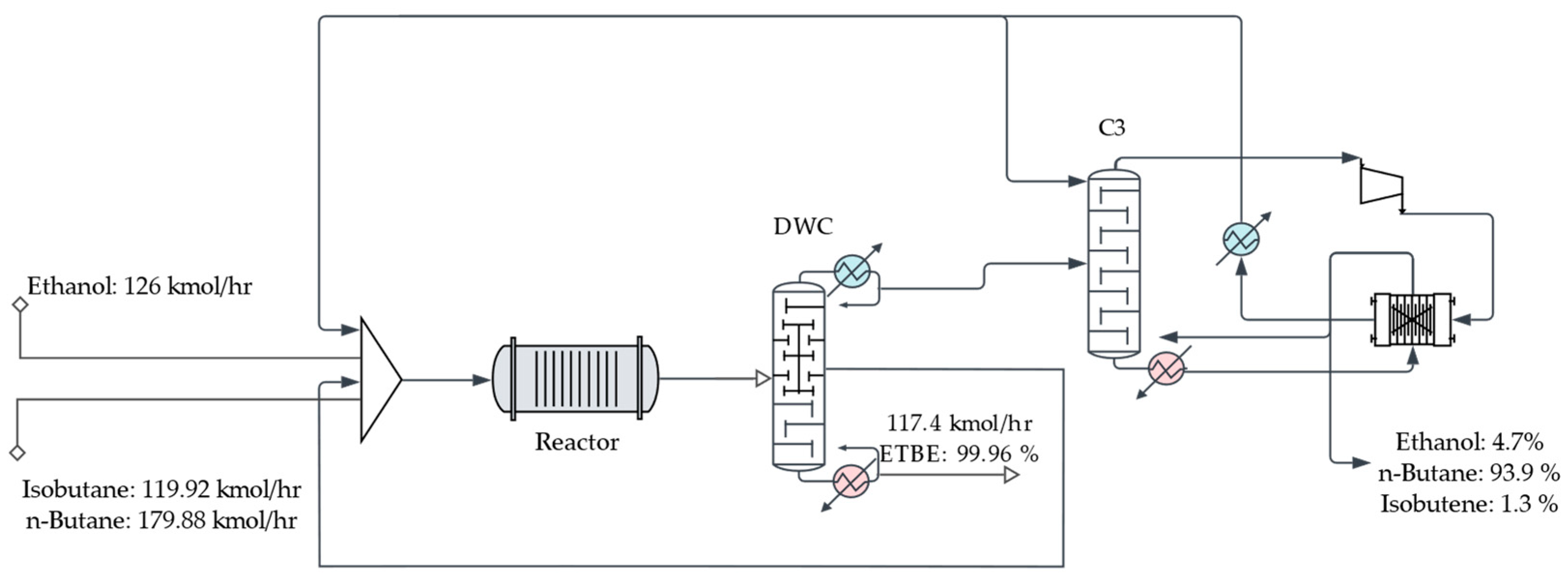 - Gómez-Ochoa, M.; Jiménez-Gutiérrez, A. Design of intensified chemical processes for the production of ethyl tert-butyl ether. Chem. Eng. Process. Process Intensif. 2024, 196, 109651. [Google Scholar] [CrossRef]