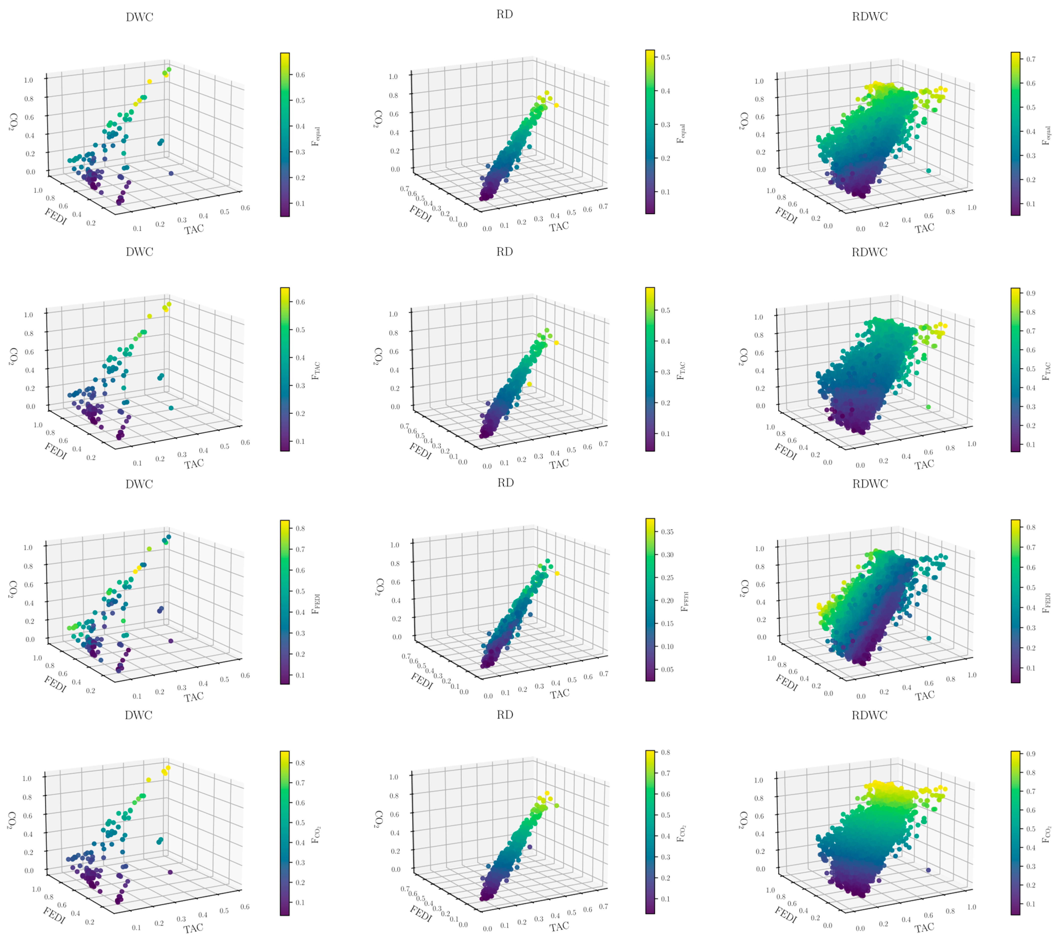 From all the trials performed with the Optuna framework, data points were collected and filtered to find the non-dominated and dominated points for each flowsheet. The results from this procedure are shown in Figure 6 for the DWC (Figure 6a), the RD (Figure 6b), and the RDWC (Figure 6c) structures. See the Supplementary Material for the performance of the optimization method as well as the values used to normalize the objective functions of this work. For the formulation of the multi-objective optimization, weights were used for each component of the objective function, and four scenarios were considered. The first one gives equal weight to the three components, i.e., TAC, CO2 emissions, and inherent safety. The other three consider higher weights to each individual metric to represent policies in which preference would be given to each component. The best solutions for these weighted scenarios are shown in Table 3, which includes the preferred process flowsheet along with details of the operating conditions and the value for each of the economic, environmental, and inherent safety metrics.