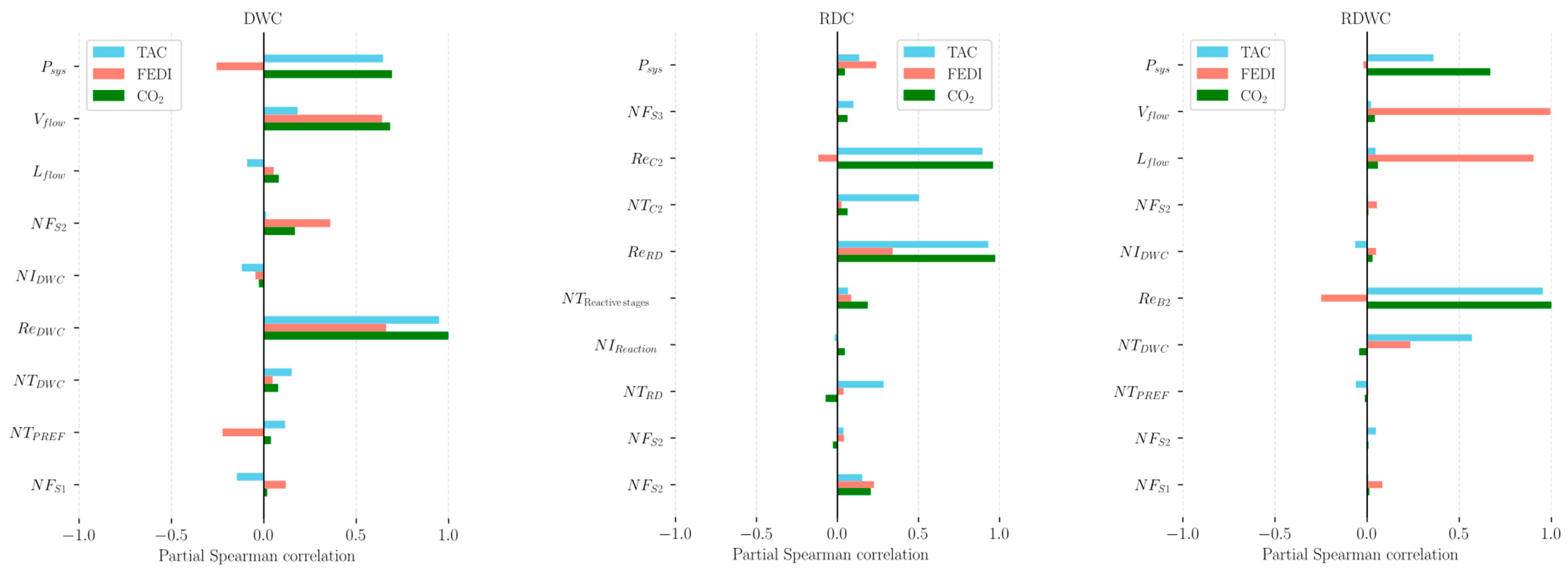 Figure 8 shows the partial Spearman correlation between manipulated variables and objective functions. Partial correlation analysis identified the net effect of operational variables on economic performance, process safety, and environmental impact for the three configurations evaluated.