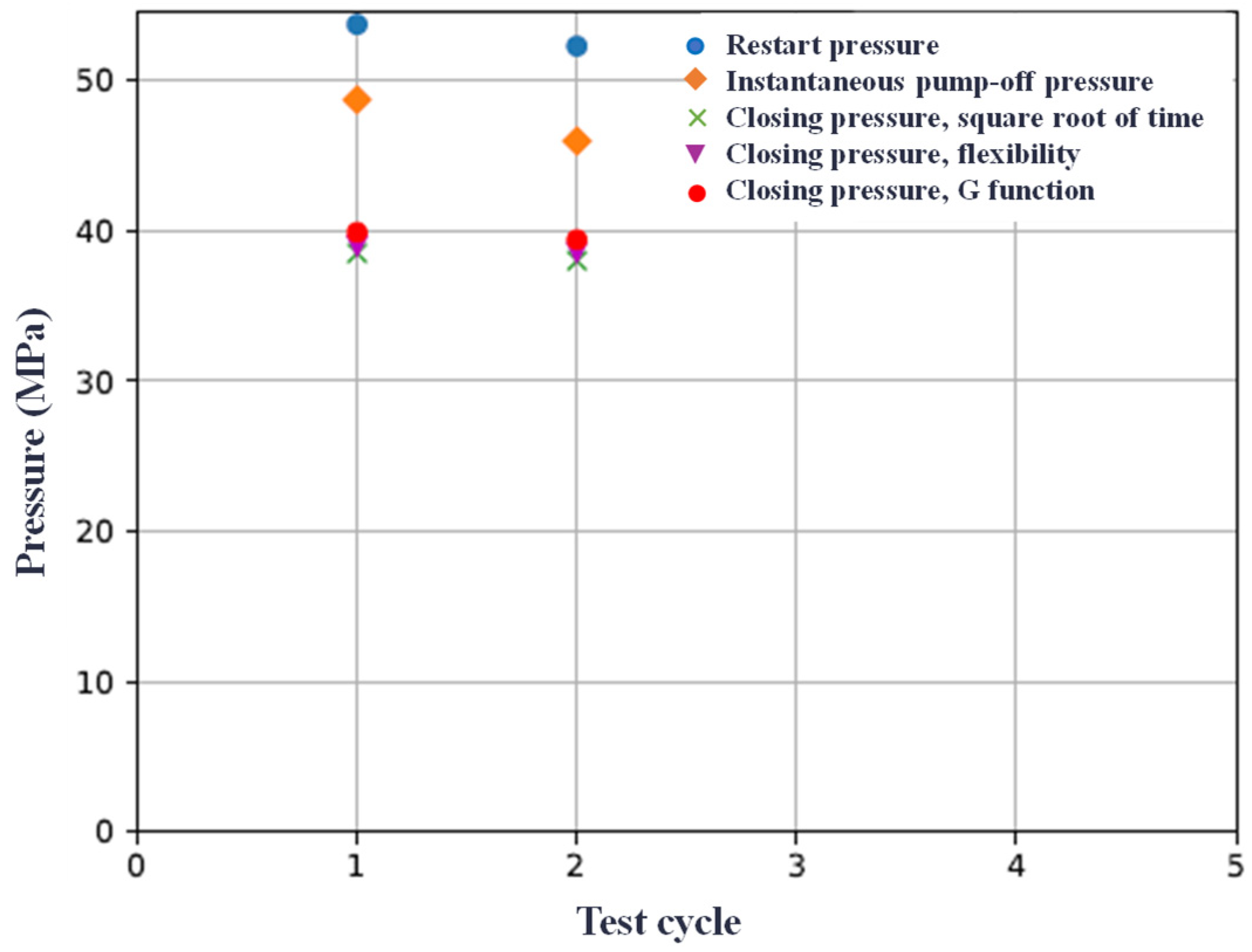 Figure 7 shows the injection flow rate and bottomhole pressure variation curves for each cycle. Three interpretation methods, including the square-root-of-time method, were used to determine the fracture closure pressure (i.e., the minimum horizontal principal stress). The results obtained from the three methods showed strong consistency.