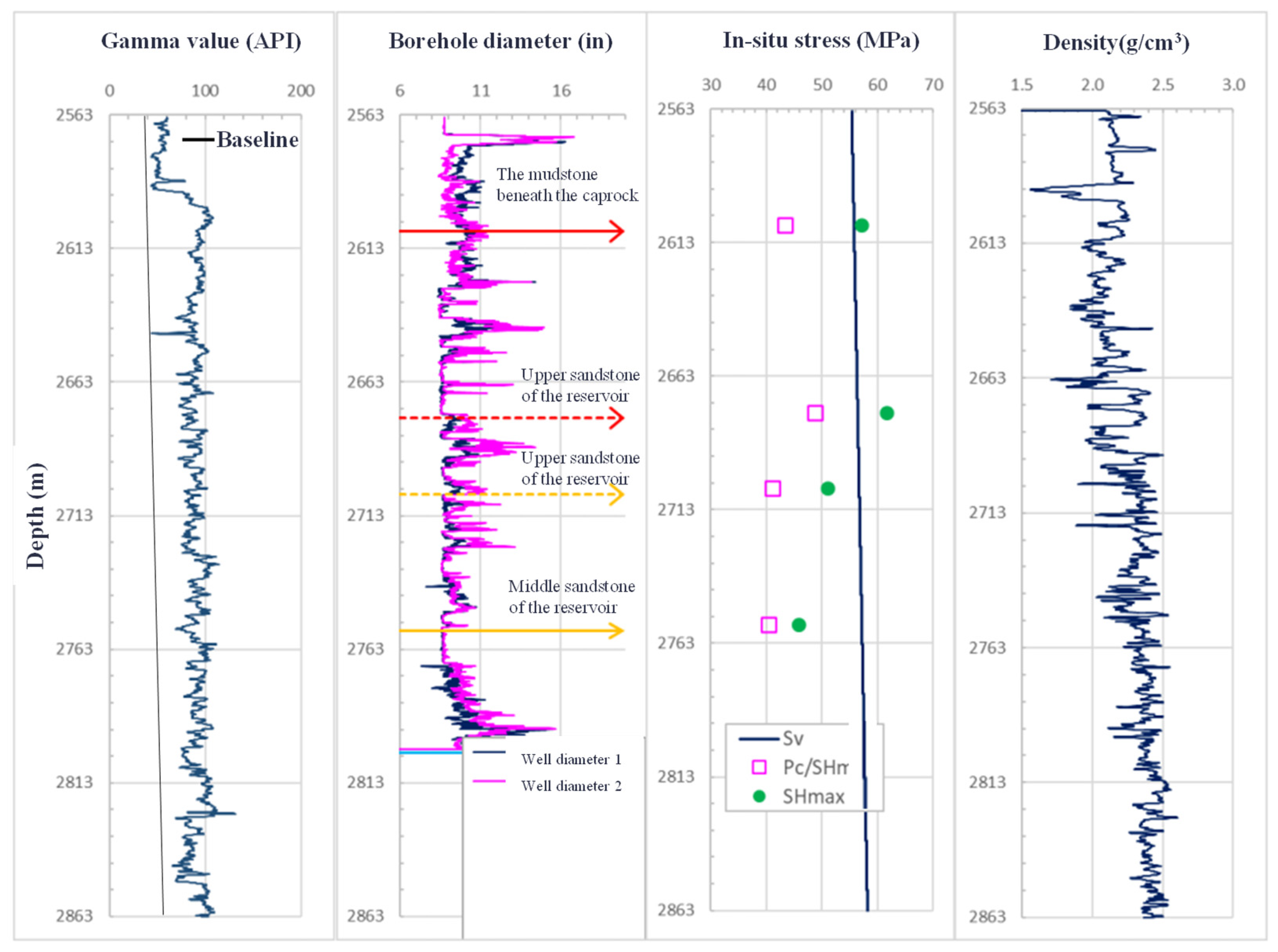 Figure 8, the horizontal in situ stress in the mudstone section of the lower caprock (depth: 2606.5 m) in Well A is relatively high, a result consistent with conventional geological understanding. Typically, mudstone caprocks exhibit relatively high in situ stress characteristics due to their high stiffness and low permeability. This mechanical property helps enhance the sealing performance of the gas storage.