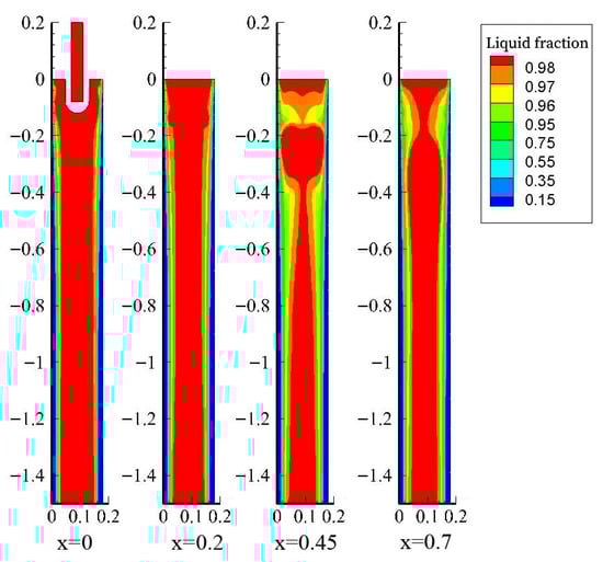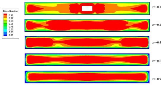 The distribution of liquid phase ratios in different longitudinal sections of the molten steel inside the mould is shown in Figure 4. The liquid–solid fields and distributions of the molten steel in the casting billet are corresponded to Figure 3. The liquid molten steel gradually solidifies into a solid state under the cooling influence exerted by the mould along the casting billet pulling speed direction, and the solidified billet shell gradually thickens with the continuous downward movement of the casting billet. The non-uniformity of solidification is not well reflected in the longitudinal section of the liquid phase ratio distribution map, and the liquid–solid phases are basically symmetrically distributed.