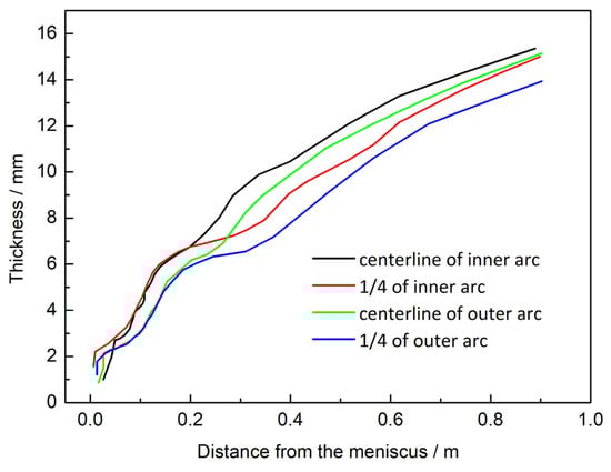 Figure 5 shows the thickness distribution of the solidified layer of the cast billet at different positions inside the mould. Overall, due to the significant unevenness of the reverse calculated heat flux on the same wide surface, the heat flux on the two wide surfaces is not symmetrical, resulting in an uneven distribution of the calculated shell thickness. At the exit of the mould, the average thickness of the inner arc and outer arc shells is 15.2 mm and 14.5 mm, respectively, with a difference of 4.6%. The results of shell thickness are consistent with the research findings reported by Cho et al. [29] and Zhu et al. [30]. The difference in the average heat flux calculated from the two wide surfaces is 5.4%, and the overall trend of heat flux and shell thickness is consistent. In the high heat flux zone from the meniscus to 200 mm below it, the growth rate of the shell is significantly faster, and the average thickness of the shell reaches 6 mm at the 200 mm position. Below the high heat flux zone, the growth of the shell gradually slows down with the decrease in heat flux. The appearance of air gaps in the area below 400 mm from the liquid level of the mould significantly reduces the heat flow, and further slows down the growth rate of the shell at different positions. At the outlet of the mould, the inner arc center and 1/4 wide surface of the billet shell are relatively uniform, measuring 15.4 mm and 15.0 mm, respectively. The uniformity of the outer arc shell is poor, with a thickness of 15.1 mm and 13.9 mm at the center and 1/4 wide surface positions, respectively. The surface temperature of the shell is high within the range of 1/4 wide surface to 200 mm from the narrow surface, and weak shells with local high temperatures are prone to defects such as longitudinal cracks. Based on the above results, obtaining the non-uniform flow field of molten steel and the solidification state of the billet shell through inverse calculation of heat flux can provide important clues for further research on the generation and online prediction of longitudinal and surface cracks [31].