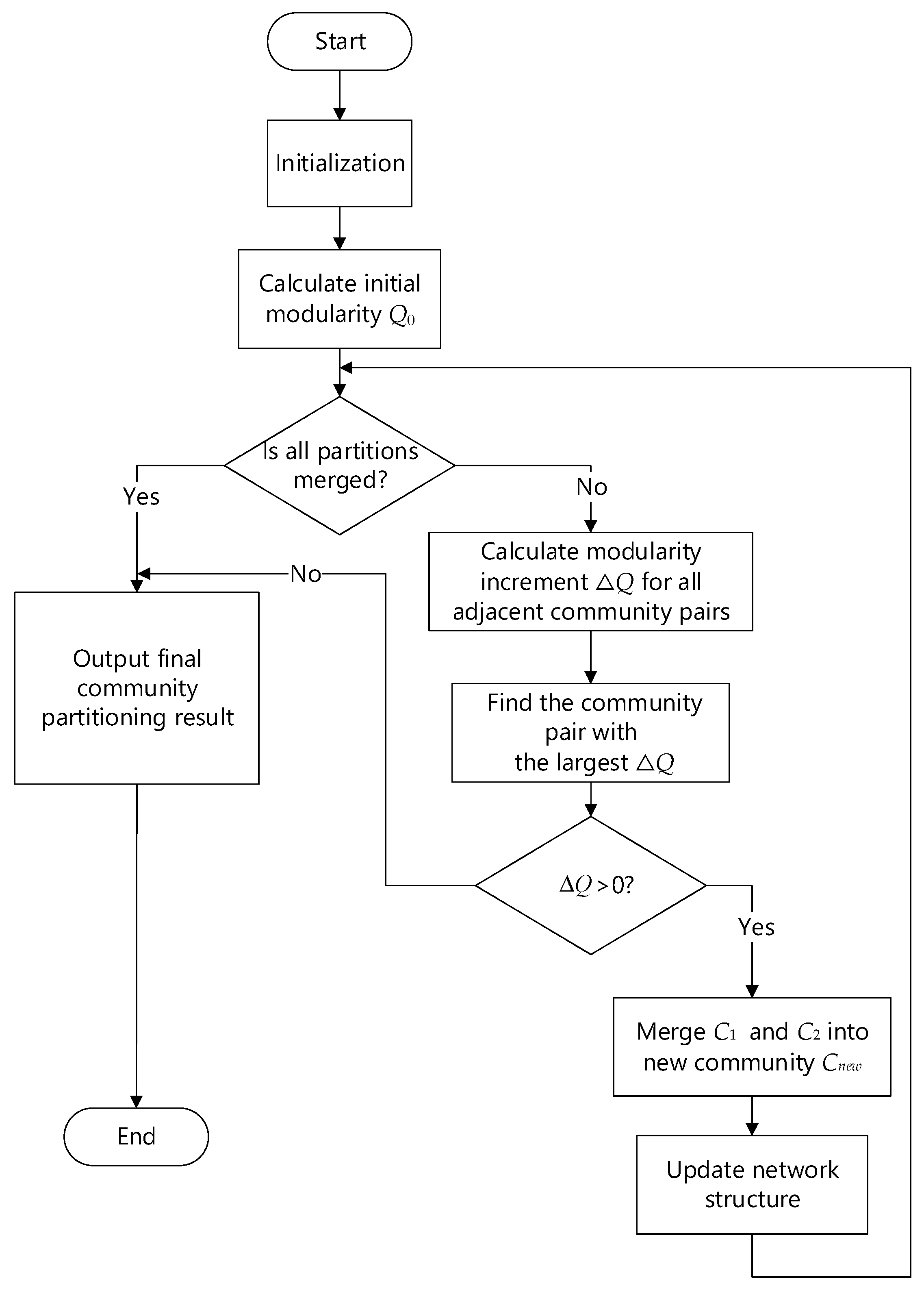 - Step 5: Repeat the calculation of ΔQ, community merging, and network structure updating until all possible merges cannot increase Q. Finally, the optimal partition scheme is obtained.
