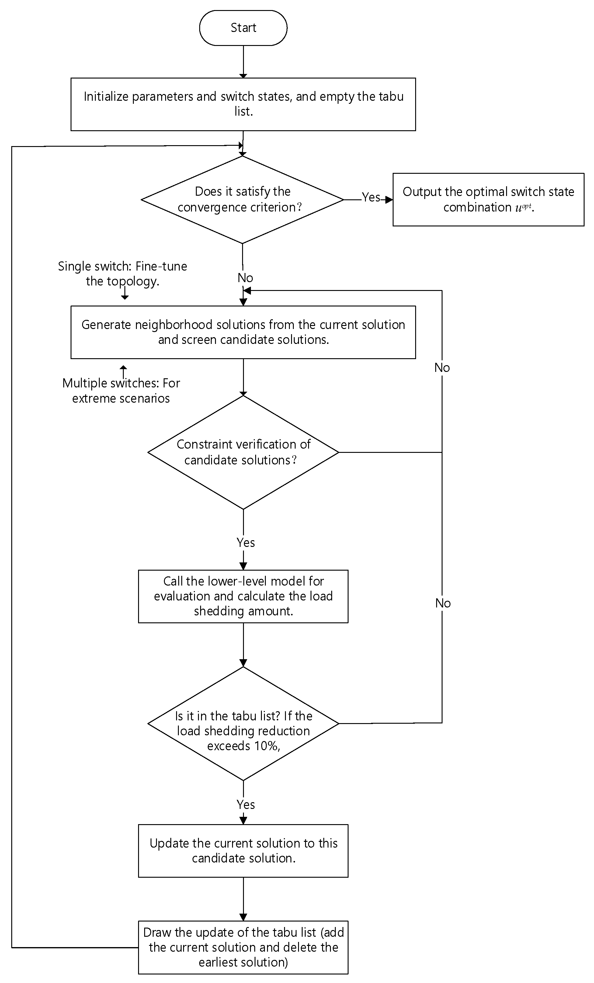 - Upper-Layer Adjustment: The upper-layer TS algorithm receives the feedback. The load shedding amount is used to evaluate the fitness of the current topology uTS. Based on this fitness and the tabu rules, the TS algorithm generates a new neighborhood solution, and the process repeats from (1). The outer loop terminates when the TS convergence criteria are met.