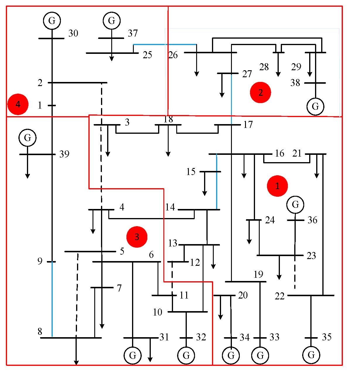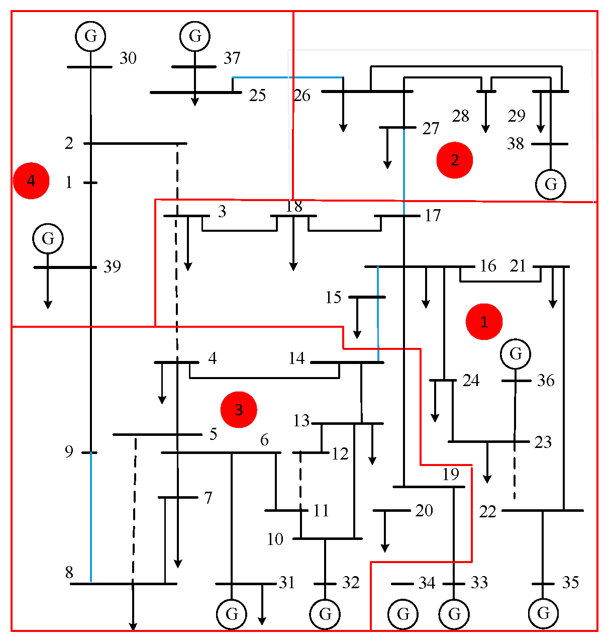 - Global Consensus Update: The coordinator gathers and from the two partitions connected by tie-line m. The new global consensus value is their average:This step ensures the power flow on the tie-line is consistent for both sides.
