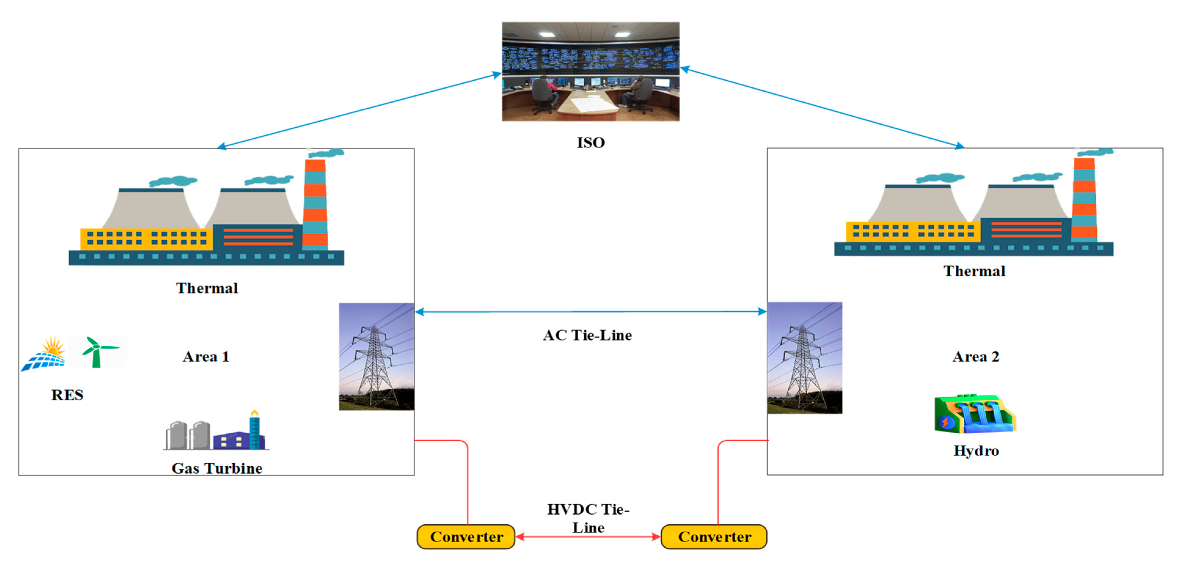 The viability of building a thermal power plant, a hydro power plant, or a gas power plant that would provide electricity to two different regions in a decentralized energy market is examined in this study. At 4000 megawatts, Area 2 has twice the power generation capability of Area 1. Area 1 can handle 2000 MW. There are 2 Generation Companies (GENCOs) as well as two Distribution Companies (DISCOs) in each area. Both of these (GENCO 1 as well as GENCO 3) rely on the thermal and gas power plants as their main source of power. A hydroelectric facility (GENCO 4) and a thermal power plant (GENCO 2) produce the energy for the first two power sectors. To establish contracts or relationships between GENCOs as well as DISCOs, the Independent System Operator (ISO) uses a bidding process. This is accomplished through a process called competitive bidding. These stations are connected using a parallel AC-HVDC tie-line system. Figure 1 [24] displays the schematic structure of the system that is being explained.