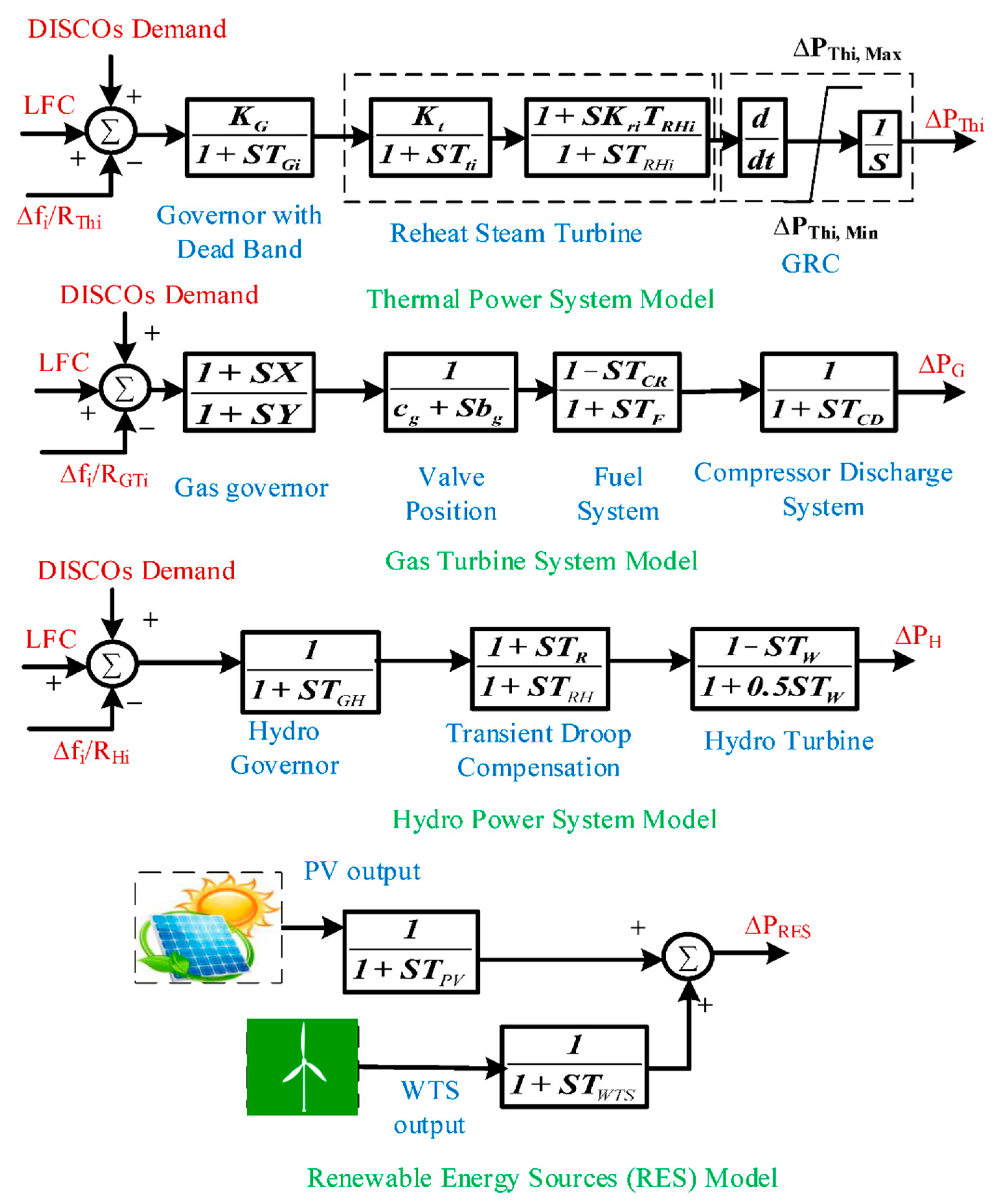Figure 2 [24] and Figure 3 illustrate two mathematical models of the interlinked system and individual GENCOs, respectively, to illustrate the concepts in this study. In order to limit the rate of power output, thermal power systems are increasingly using Generation Rate Constraint (GRC) nonlinearity. The ANN-based (PIλ + PIλf) controller is employed to maintain stability over time. A modified IET-based HVDC tie-line model is used for simulation experiments in order to better comprehend the substantial influence on the system’s dynamic behavior.