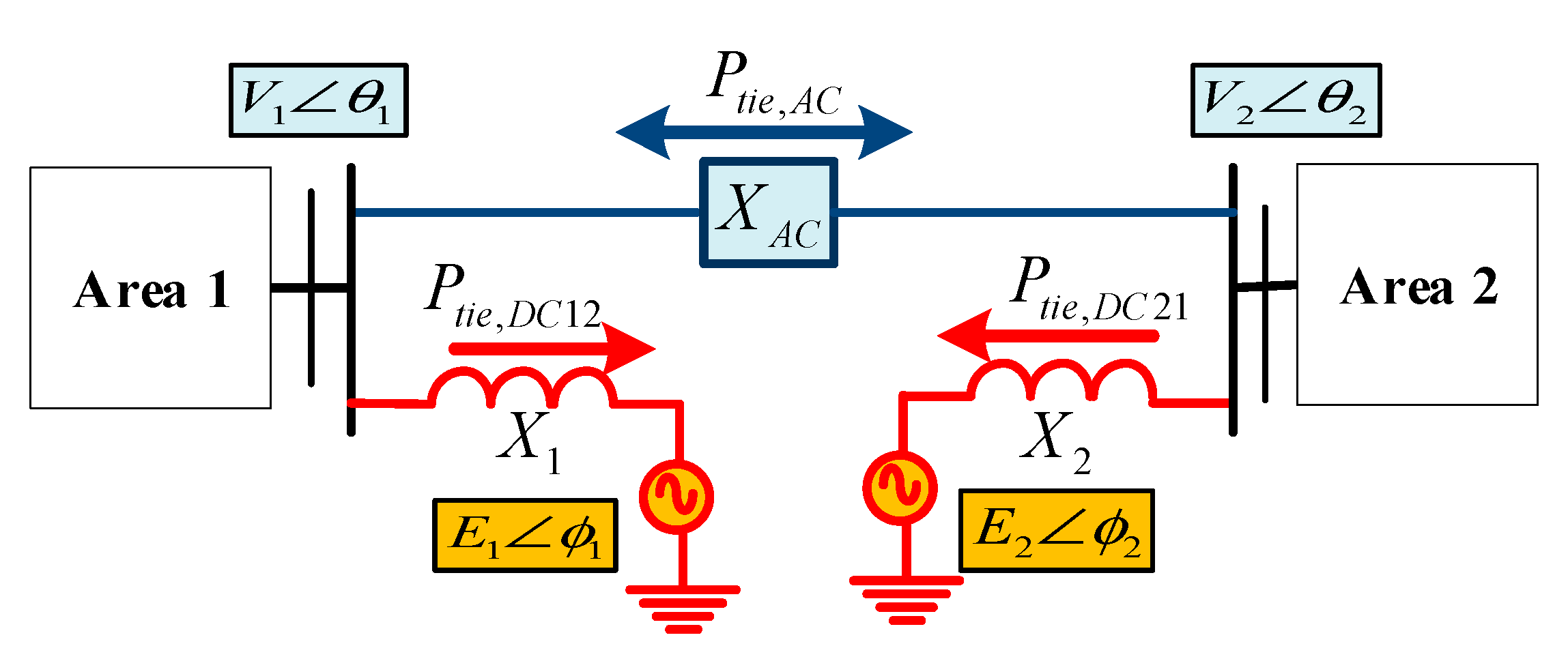 Two separate capacity areas are defined by the test system: one with a 2000 MW capacity and the other with a 4000 MW capacity. Figure 1 shows the parallel AC-HVDC tie-line system’s ends. The capacity of the AC and HVDC connect lines to transmit up to 200 MW and 600 MW of energy, respectively, is assumed. To demonstrate HVDC power electronic converters, the voltage sources E1 < θ1 and E2 < θ2 are connected in series with the reactances X1 and X2. The bus voltages for the first and the second areas are denoted by the symbols V1 < θ1 and V2 < θ2, respectively. Figure 4 uses these components to illustrate an electrical equivalent circuit. Power flow over both AC and HVDC tie-lines must be linearized using Equations (2) and (3).