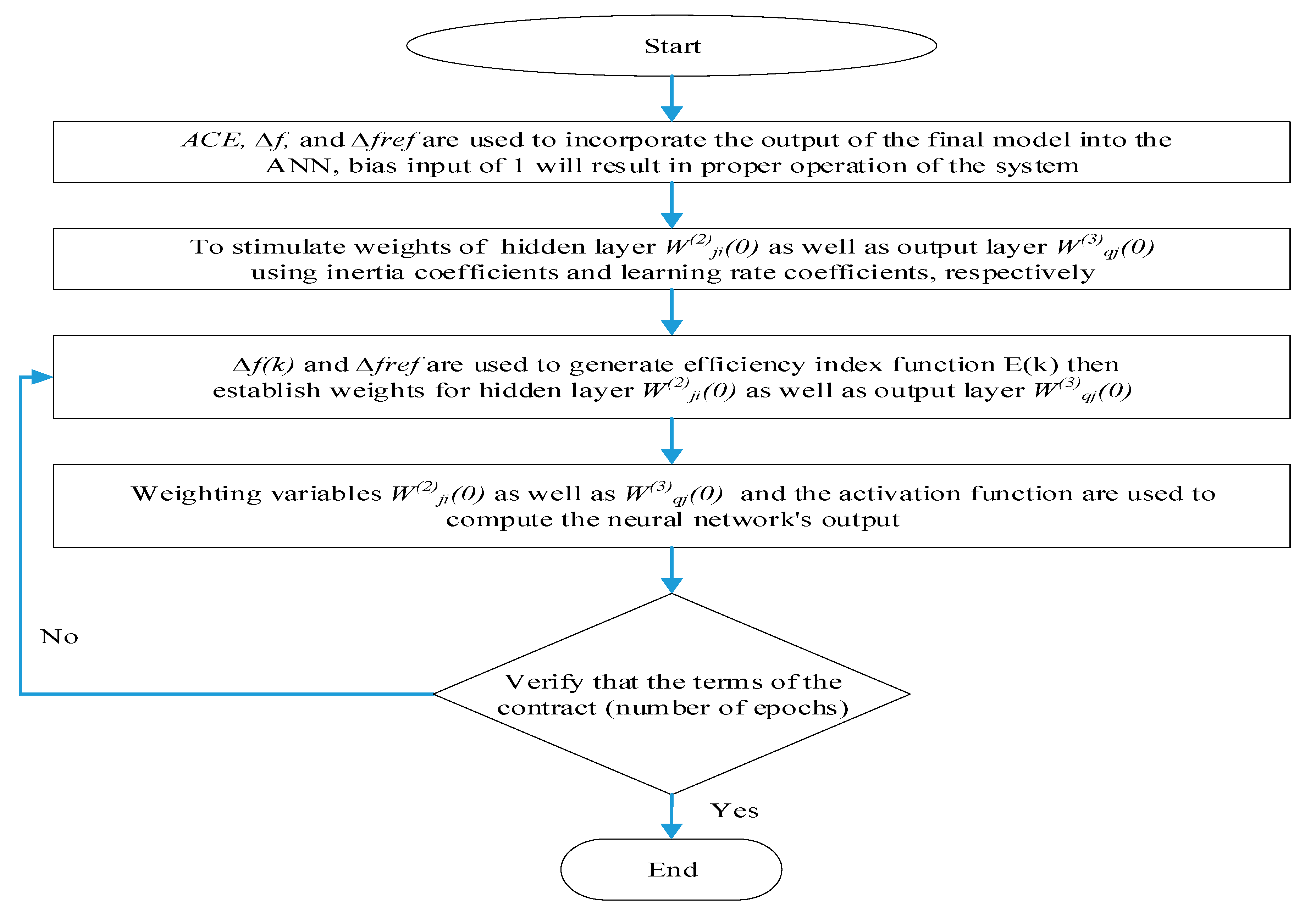 The authors make an effort to minimize the inaccuracy of their work because it could be interpreted as a result of the discrepancy between the actual and projected rates of outlier occurrences. To find out the optimal (PIλ + PIλf) gains for the system (the ANN has output), the neural network’s connection weights can be iteratively updated using the backpropagation technique. The only way to achieve this is to significantly reduce the speed. The ANN can produce results even if it has not been trained. The neural network’s parameters are taught to the controller via the backpropagation technique. The study employs a three-layer ANN trained using the backpropagation algorithm, where connection weights are iteratively optimized using a suitable learning rate and inertia terms. The tuning of these parameters directly influences error minimization, controller adaptability, and frequency stability in the power system, leading to faster settling times, reduced overshoot, and improved dynamic performance. Table 2 shows the summary of the performance of the ANN.
