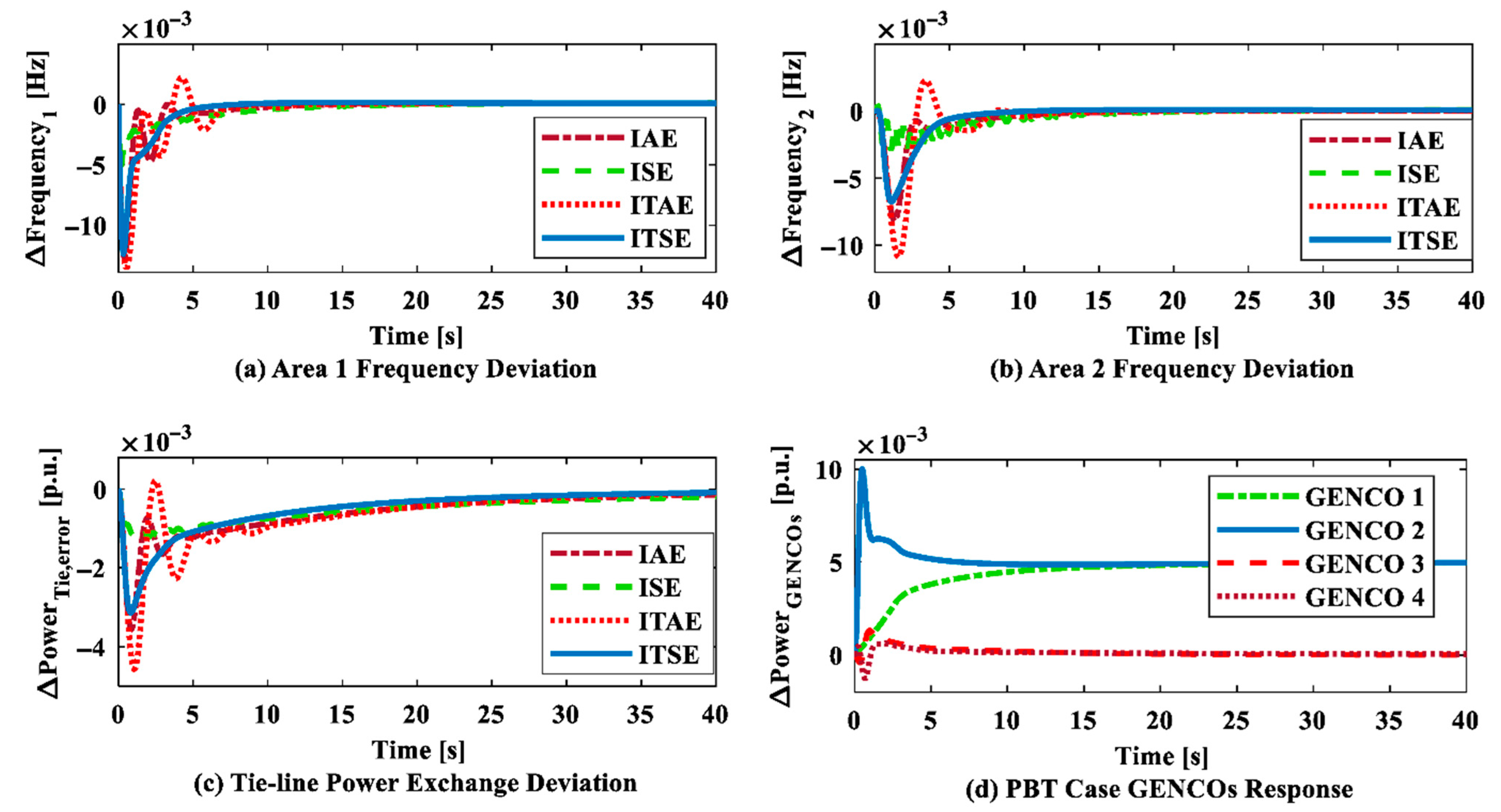Figure 11. Four objective functions test the system results: (a) Area 1 frequency deviation, (b) Area 2 frequency deviation, (c) Deviation in tie-line power exchange, and (d) PBT case GENCO response.