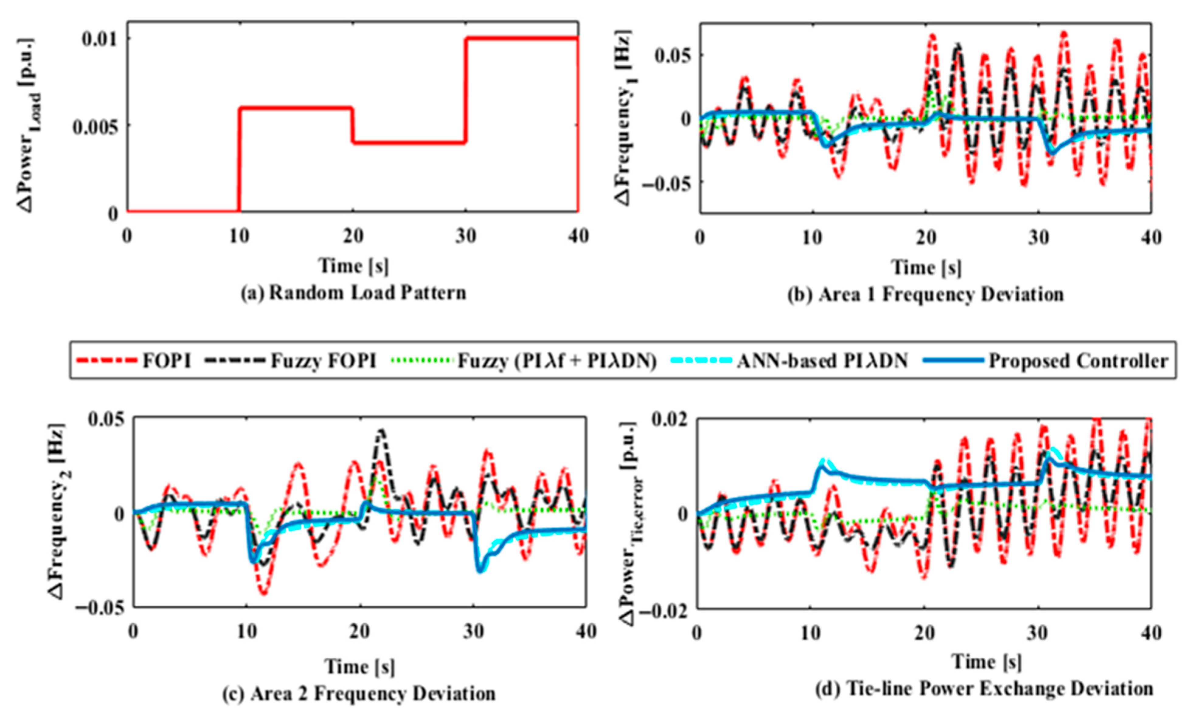 Figure 12. Different controllers for RLD test system results: (a) RLD pattern, (b) Frequency deviation in Area 1, (c) Frequency deviation in Area 2, and (d) Deviation in tie-line power exchange.