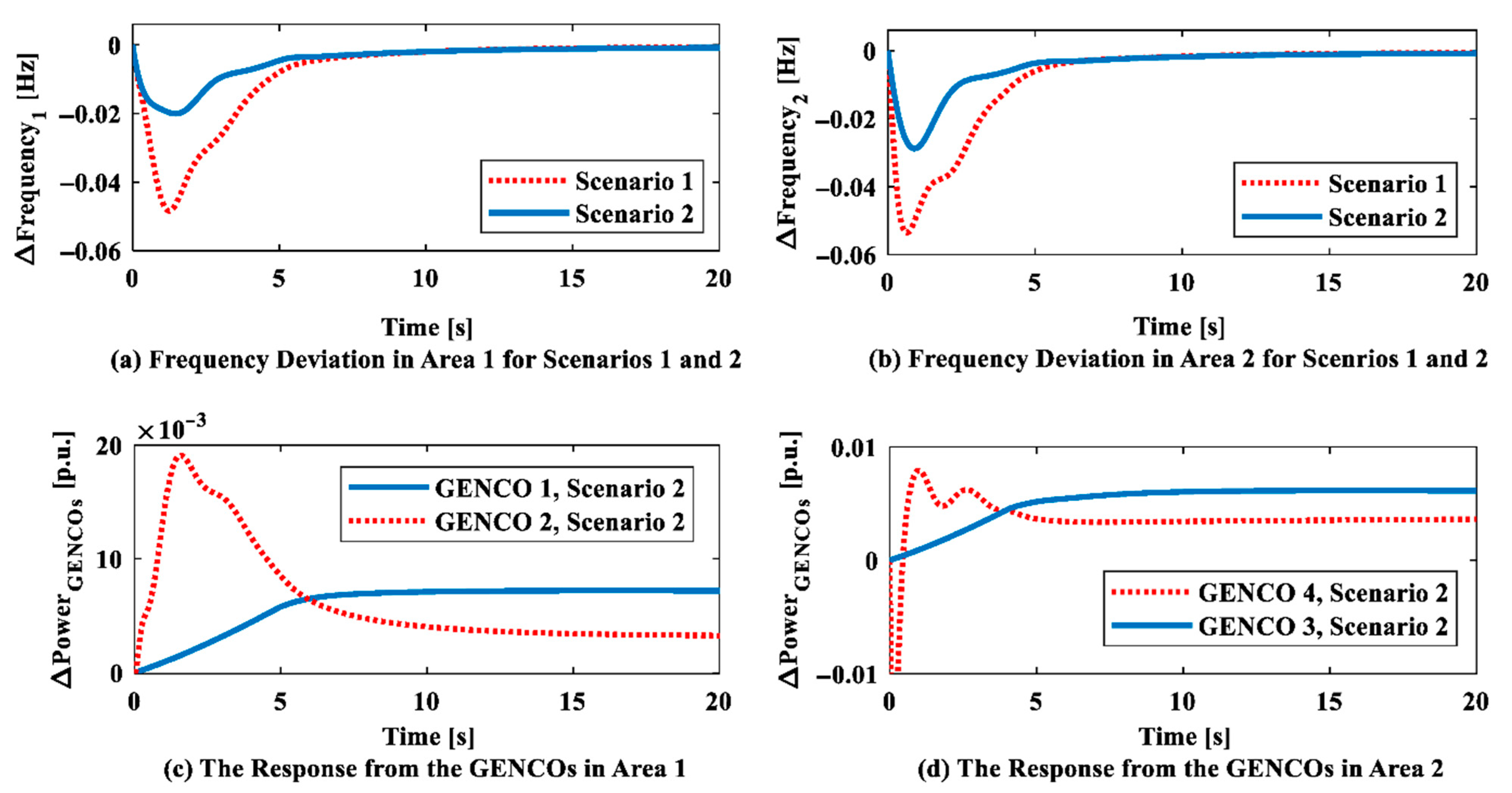 Figure 13. The BBT reaction consists of (a) Area 1 frequency deviation for Scenarios 1 and 2, (b) Area 2 frequency deviation for Scenarios 1 and 2, (c) the GENCOs’ response in Area 1, and (d) the GENCOs’ response in Area 2.
