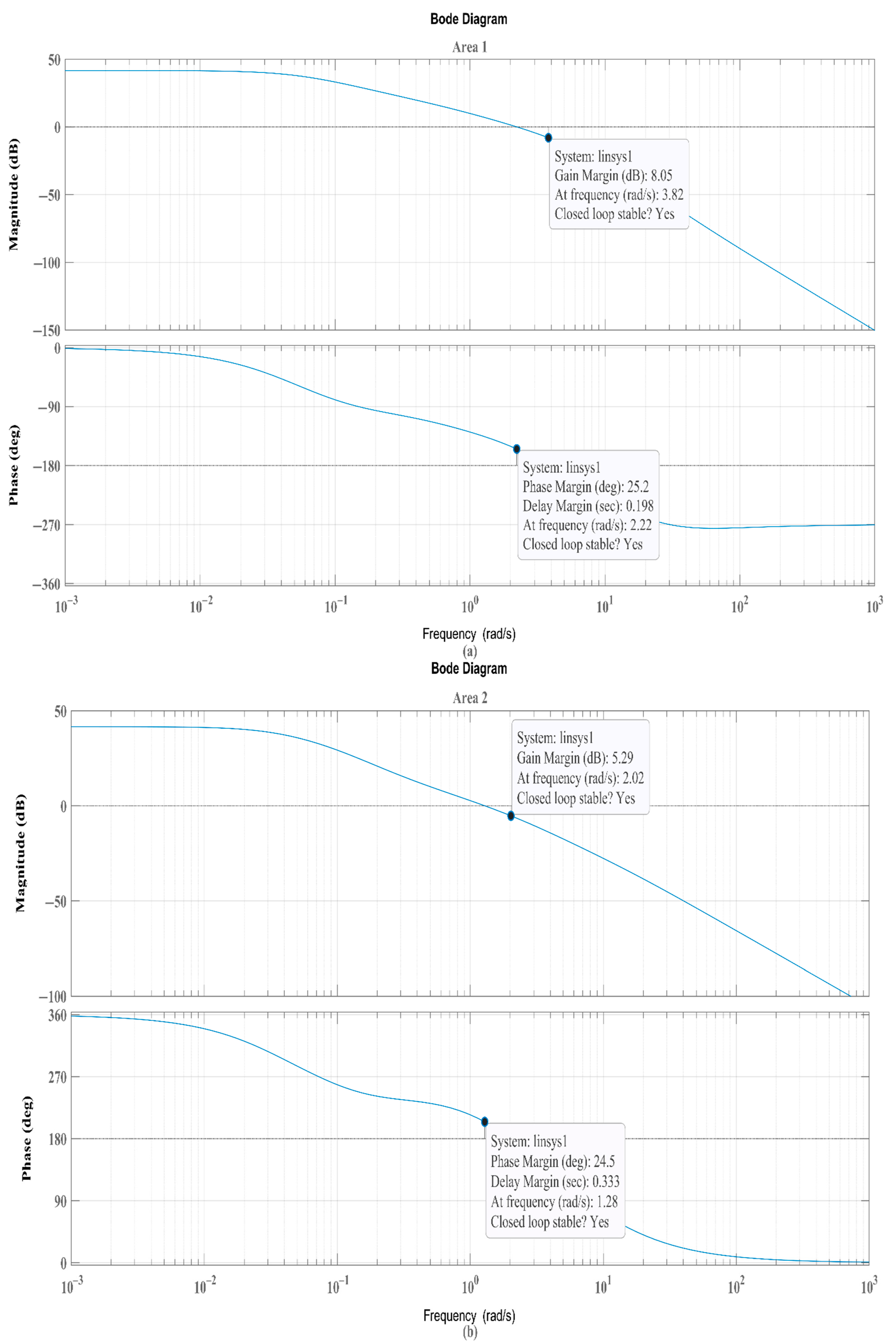 Figure 15. Closed-loop transfer functions of Bode plots: (a) Area 1 and (b) Area 2.