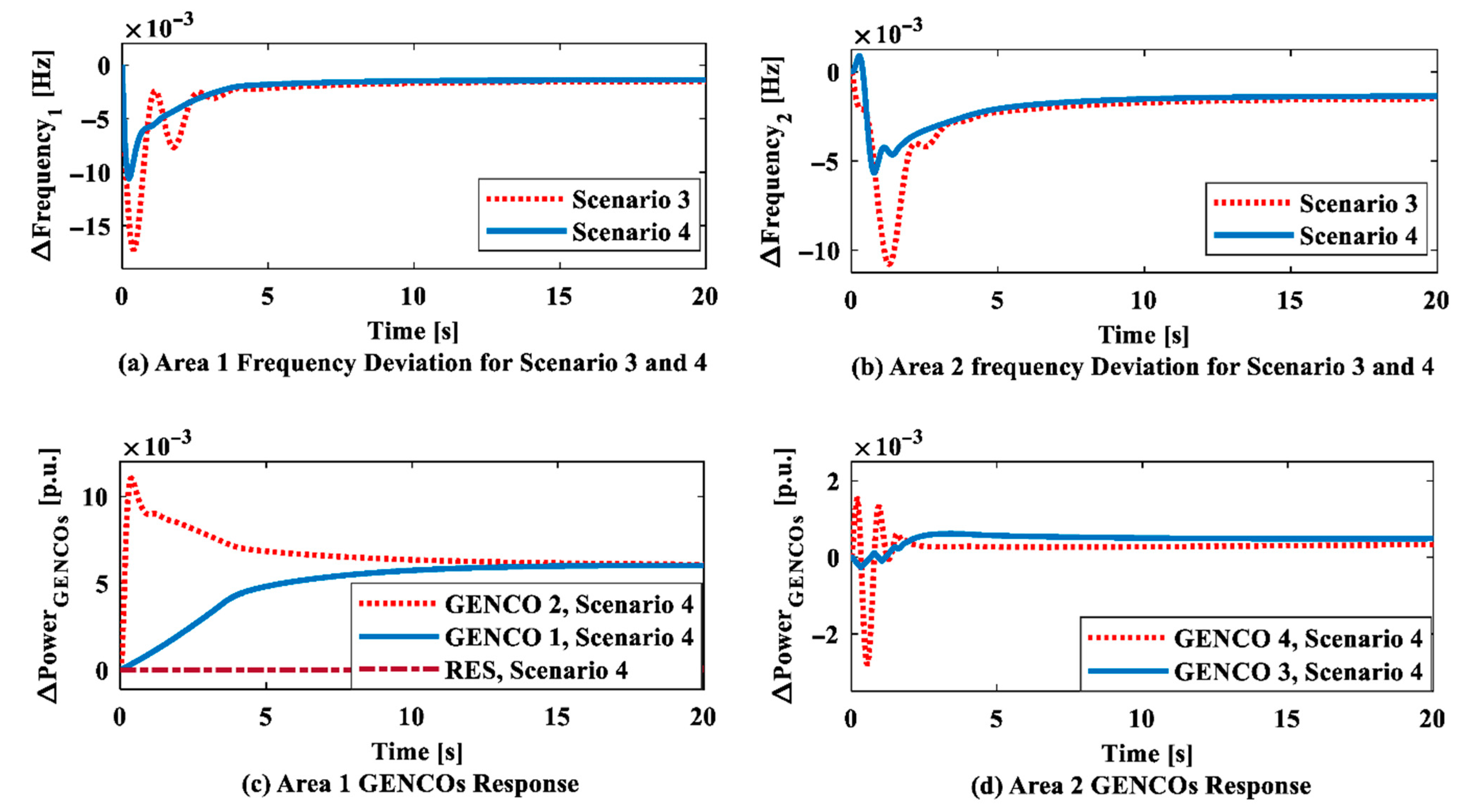 Figure 16. CVT response of the tested system: (a) Area 1 frequency deviation for Scenarios 3 and 4, (b) Area 2 frequency deviation for Scenarios 3 and 4, (c) GENCO response of Area 1, (d) GENCO response of Area 2.