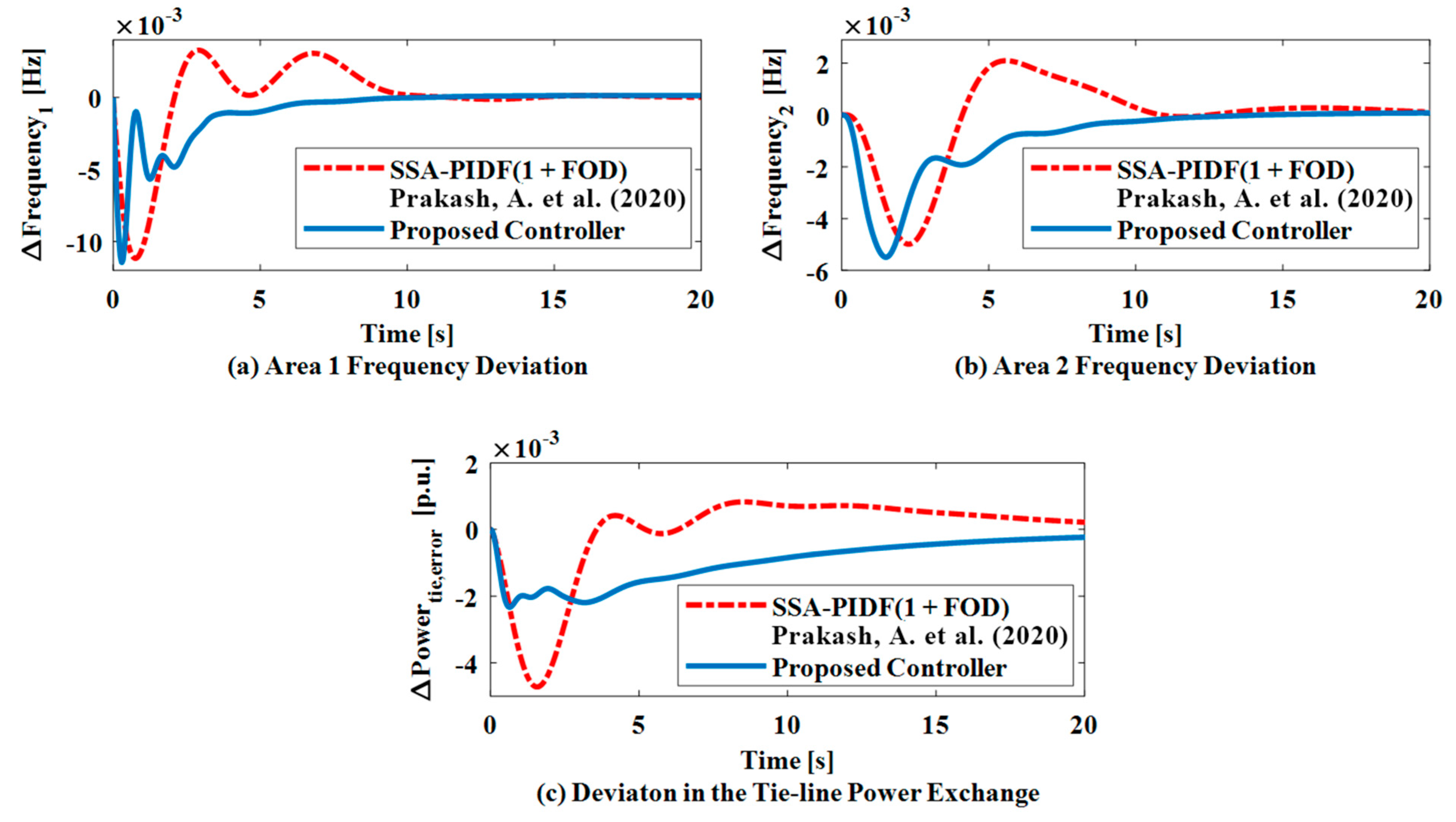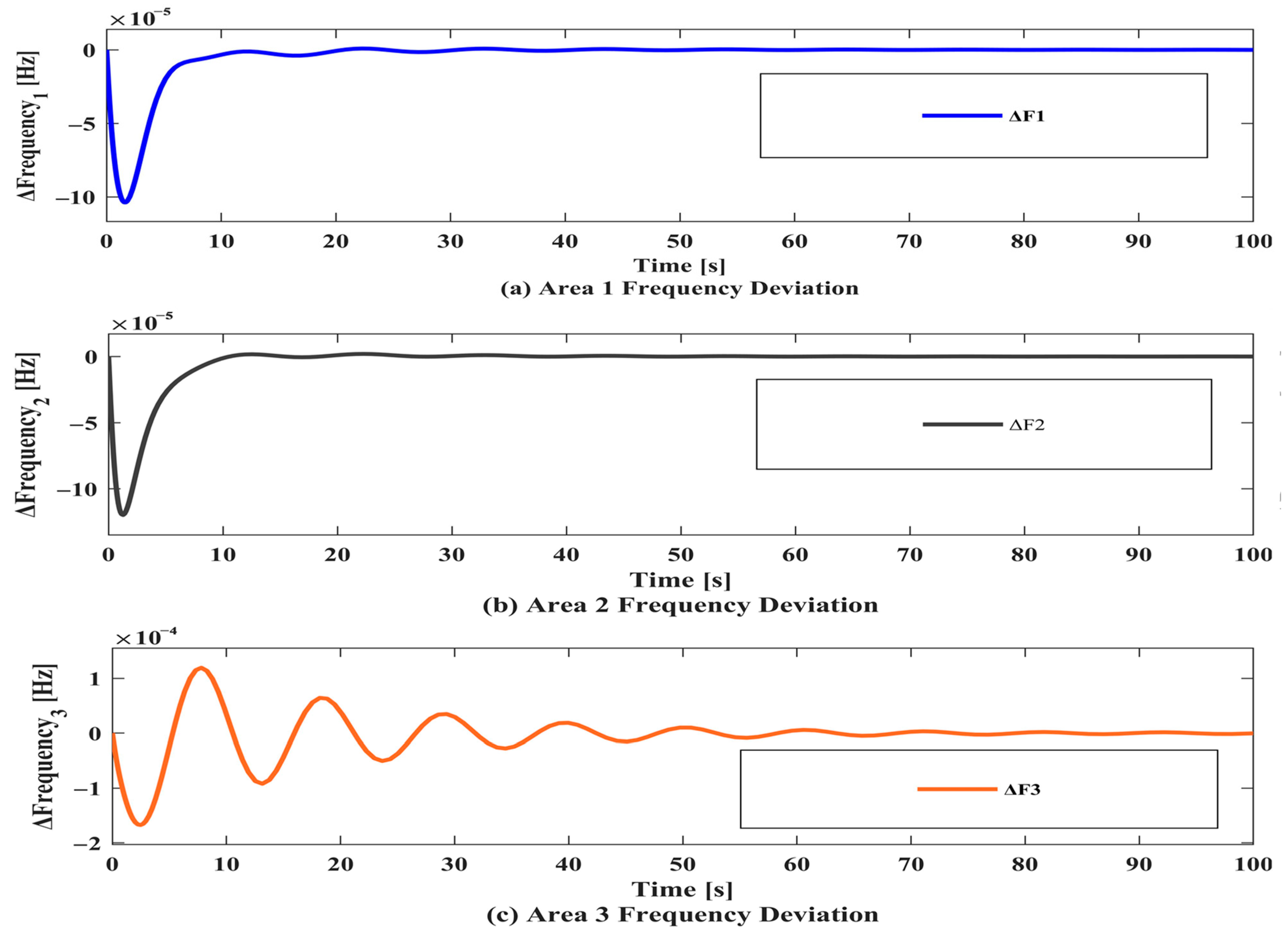 Figure 18. Test system response [30]: (a) Area 1 frequency deviation, (b) Area 2 frequency deviation, and (c) Deviation in tie-line power exchange.