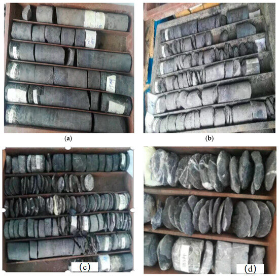 The cores obtained from the mudstone and sandy mudstone intervals—located 0–5 m and 16–21 m from the borehole collar—are presented in Figure 1a and Figure 1b, respectively, showing good formation integrity. In contrast, the cores from the limestone interval (12–16 m) are displayed in Figure 1c,d, exhibiting an agglomerated and fragmented state. For relatively intact mudstone and sandy mudstone in the 0–5 m and 16–21 m intervals, their shear strength typically ranges from 1.2 to 2.5 MPa (with sandy mudstone exhibiting slightly higher values, approximately 1.8–2.8 MPa). This is attributed to the dense arrangement of mineral particles. Their bulk density falls between 2.2 and 2.5 g/cm3; these physical and mechanical properties are responsible for the good formation integrity observed during coring. In contrast, the agglomerated and fragmented limestone in the 12–16 m interval has lower shear strength (approximately 0.8–1.5 MPa). Fragmentation weakens the intergranular bonding force, leading to this reduction. Its bulk density also decreases slightly, ranging from 1.9 to 2.2 g/cm3. This mechanical parameter variation is consistent with the fragmented state of the limestone observed in coring and directly manifests the disparity in rock stability across different intervals.