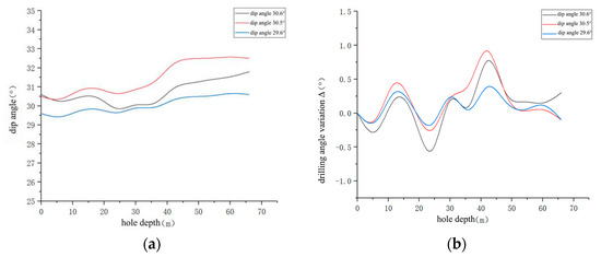 Schematic diagram of the gas drainage borehole inclination angle of 30° and its variation value with hole depth: (a) Schematic diagram of the variation in the inclination angle of the gas drainage hole with the hole depth. (b) Schematic diagram of the variation in the inclination angle of the gas drainage hole with the hole depth.