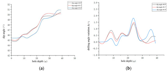 Schematic diagram of the gas drainage borehole inclination angle of 45° and its variation value with hole depth: (a) Schematic diagram of the variation in the inclination angle of the gas drainage hole with the hole depth. (b) Schematic diagram of the variation in the inclination angle of the gas drainage hole with the hole depth.