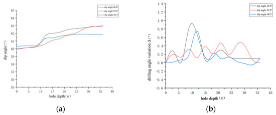 Schematic diagram of the gas drainage borehole inclination angle of 60° and its variation value with hole depth: (a) Schematic diagram of the variation in the inclination angle of the gas drainage hole with the hole depth. (b) Schematic diagram of the variation in the inclination angle of the gas drainage hole with the hole depth.